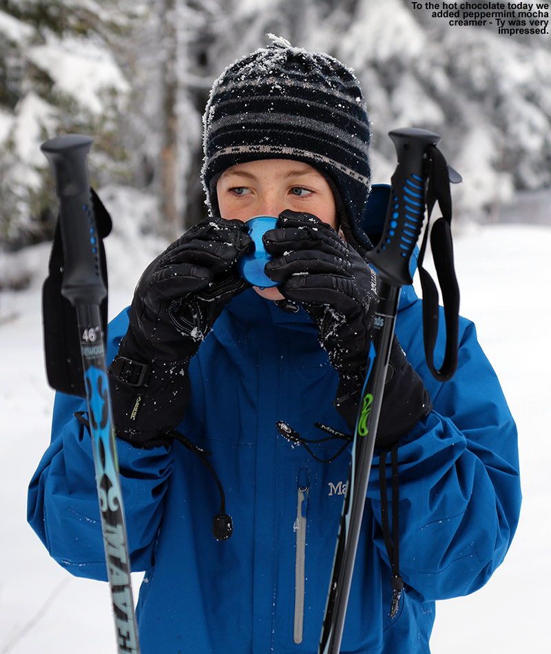 Ty enjoys some hot chocolate during our ski tour today.