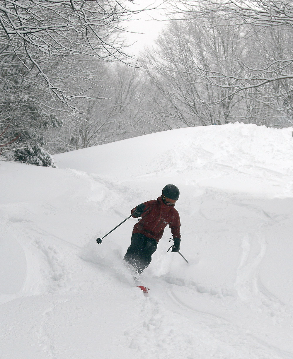 I caught first tracks down White Rabbit, which was in great shape. The base is really deep up there, with another 5 to 10 inches of powder atop the older layers. Snow Hole had seen a good deal of traffic, but there were still plenty of routes available with powder, and the traffic actually helped to compact the snow at the water crossings. Lower Turnpike was its usual smooth self and offered a nice groomed surface on which to carve some Telemark turns.