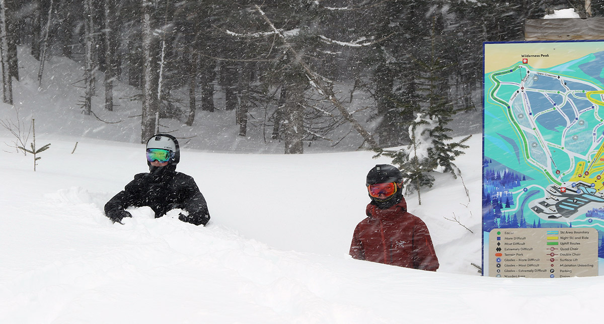 We headed up to the mountain around noontime, and the resort was hoppin’ based on the number of cars in the Village lots. With the weather and proximity to the holiday period, that wasn’t surprising. E and Ty stayed focused on the lower mountain terrain so that Ty could continue to work on his snowboard turns, and Dylan and I took the Vista Quad to see what conditions were like on the upper mountain and make our way over toward Wilderness. Skier traffic definitely had its effects on the snow surfaces, and we found lots of firm or icy areas on trails like Alta Vista and even lower-angle terrain like Sherman’s Pass. Fortunately, Wilderness had seen much less traffic and the snow surfaces were excellent. There was plenty of packed powder, chowder, or even untracked powder on the lesser-used routes. We even made our way into the Wilderness Woods, and there was plenty of coverage and very little traffic. Snowpack is certainly not an issue at elevation – I probed the depths at around 2,800’ over toward Wilderness and found as much as 30 inches. The consistency of the snowpack is interesting. There’s definitely a refrozen layer in there from the warm storm we had over the weekend, but it many spots it’s not really crusty, it’s just thick and has bonded pretty nicely to the snow that fell more recently.