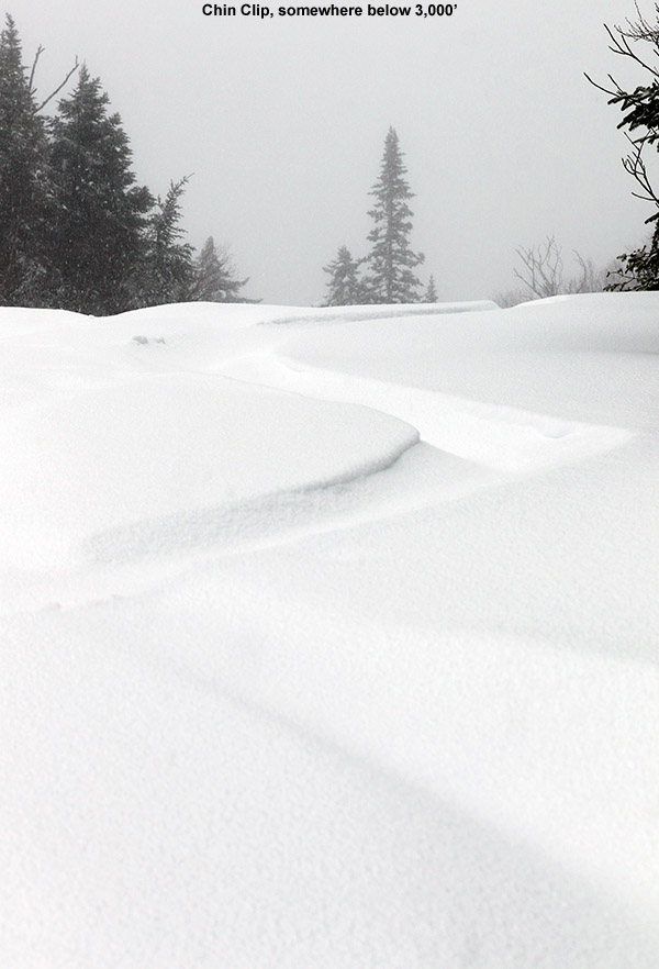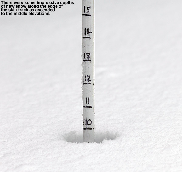 Just making that jump up to ~1,500’ at the base of the resort resulted in a huge increase in accumulations. My depth checks revealed ~10” of new snow at the base of the Gondola, and that measurement was fairly easy, since the old base had generally melted out down at that elevation. I skinned up Chin Clip Runout, since I like the grade, seclusion, and protection from any wind more than heading right up Gondolier. Actually though, winds today were pretty minimal in the lower mountain elevations, and with the temperature just a bit below freezing, it was really pleasant.