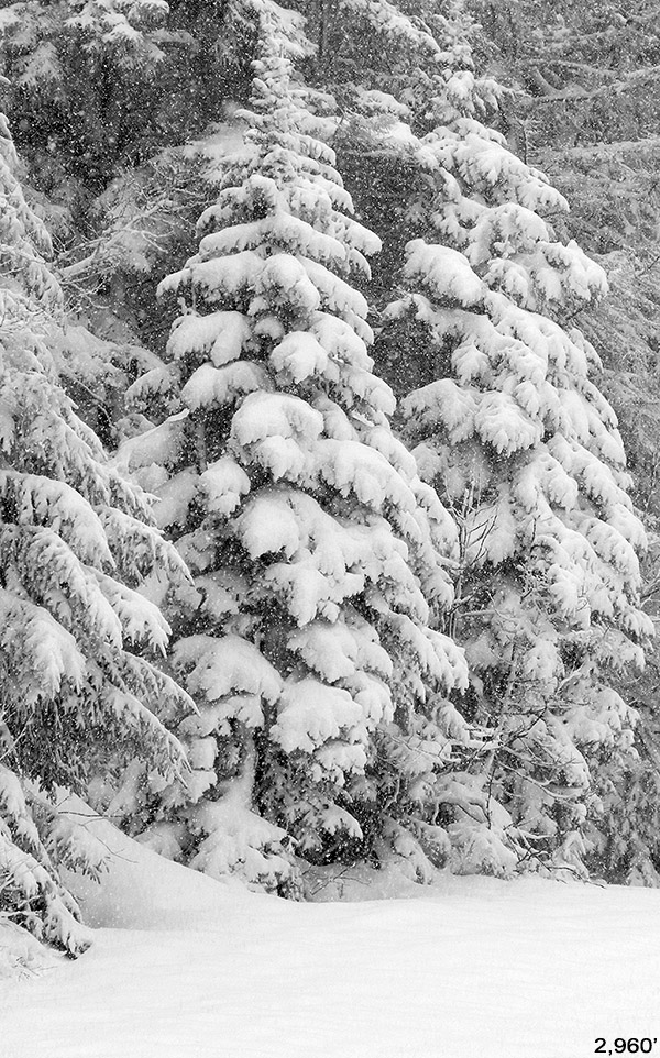 I headed up to the mountain in the afternoon, and temperatures in the Village at ~2,000’ were in the mid-teens F, but fortunately there was minimal wind. There was blue sky at times, but light snow was still falling off and on. My goal was to head to the upper glades along the Catamount Trail out past the resort boundary. Those glades are up around the 3,000’ elevation, so I suspected the snowpack would be more than sufficient.