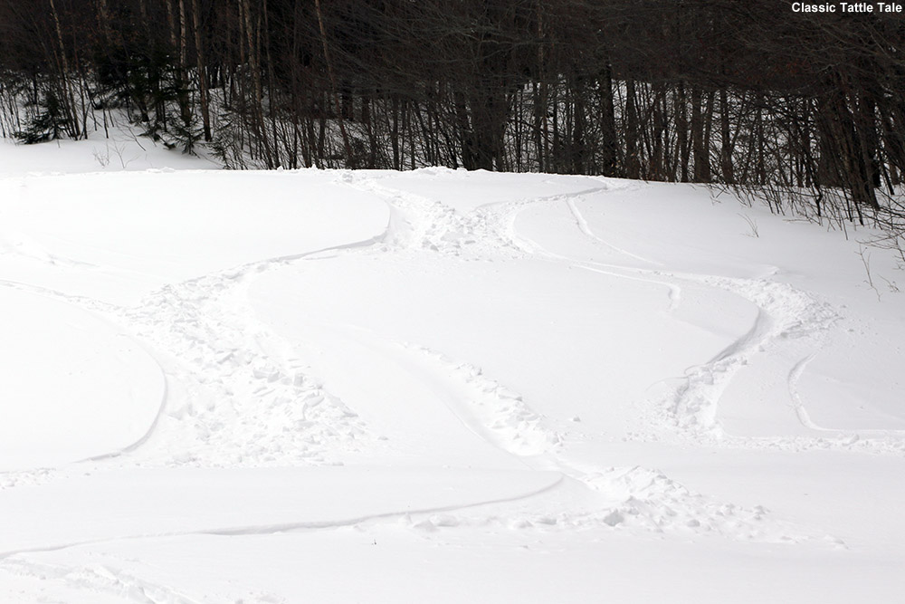 I didn’t linger too long in the lodge, but by the time I came out the snowfall had really picked up – it was falling heavily and dramatically reduced the available light as we approached dusk. I quickly headed over to the Snowflake Chair and made my way toward Timberline. I ran into a family on Timberline Lane trying to make their way back to the Bear Run condominiums where they were staying, and their younger son on a snowboard struggled to move along in the flats, and then struggled more on the ungroomed steep pitch of Timberline Run below. I headed to Lower Tattle Tale to catch some fresh tracks in the powder there (which I’d say were actually the best of the day) but waited at the intersection of Timberline Run to make sure everybody in the family was getting along OK. I actually had already pulled out my headlamp for the last bit of skiing since it had gotten so dark, and that was helpful in making sure the family found their way to their lodging.