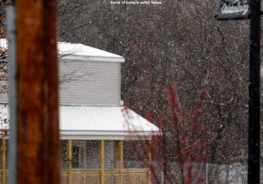 Snow filled the air down to the lowest mountain valleys today.