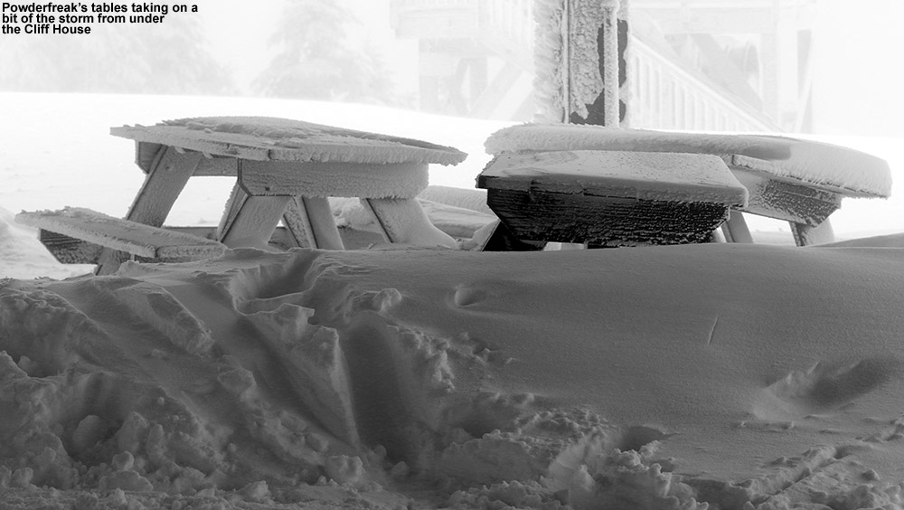 Above mid mountain I started to get into the snow guns, and I meandered here and there from Switchback to Gondolier to Perry Merrill following various skin tracks to see if there were any quiet areas. But aside from Chin Clip, they had guns running all over the place. It’s noisy and ruins the natural snow in spots, but of course the resort has to blow snow when it’s time. I actually only headed above the 3,000’ mark for the exercise and to see what was up at that elevation, because I knew the skiing was going to be much better below that point. The winds were howling on that last section of Upper Gondolier, and pounding snow from the storm combined with snow guns every 50 feet or so blasting out their little ice particles made it a virtual whiteout. It was absolutely miserable. If you’ve ever wondered why people are willing to pay a premium for really high quality alpine/backcountry/ski outerwear, there’s an example. It’s not as if it was even midwinter cold (somewhere in the 20s F), but with the snow guns added in, there was just so much liquid being blasted at you on the strong winds. Gear was thoroughly put to the test today. The skin track from the guy who was just a few minutes in front of me had absolutely vanished in that short amount of time. All I could think as I struggled up that final pitch was that if I was ever going to Tweet something at that point it would have been #itsbrutaloutthere. It was a major relief to be able to get out of the wind, snow, and the roar of the guns under the deck of the Cliff House.