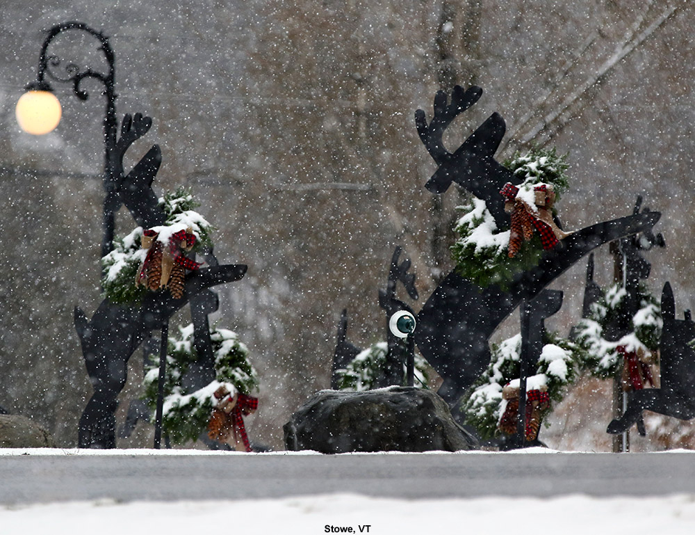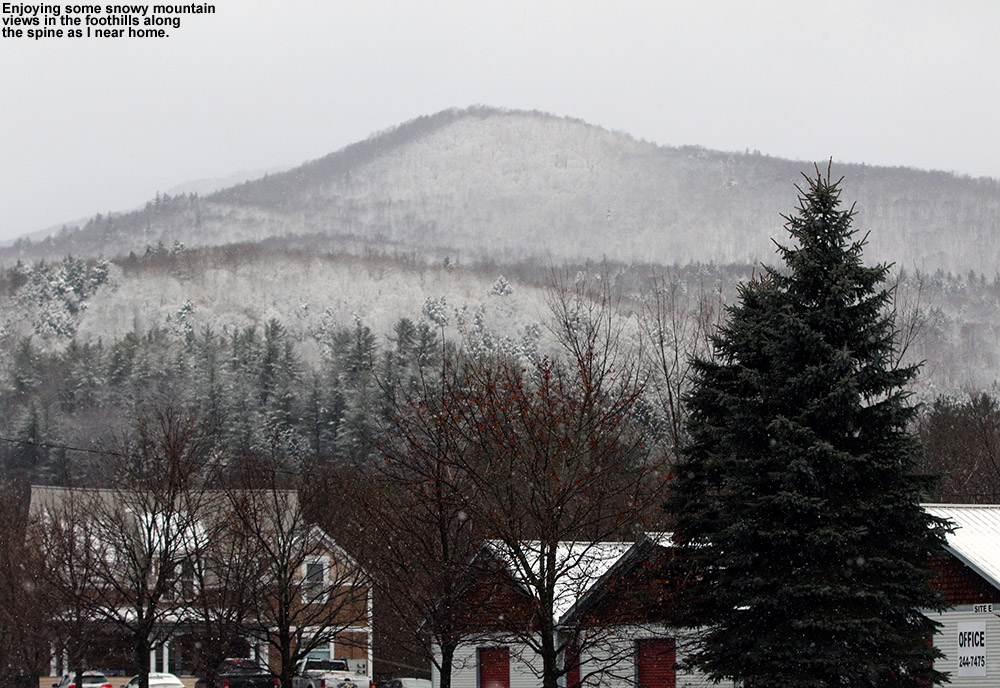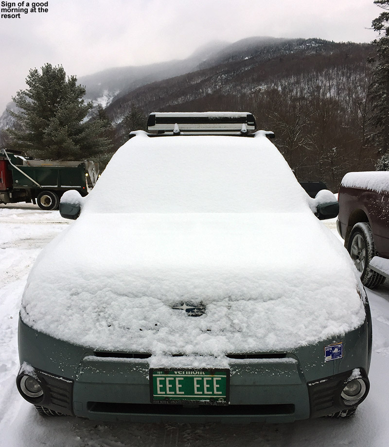 Temperatures were a degree or two above the freezing mark around in the lower mountain valleys at mid-morning when I was heading out today, and the precipitation was all snow, but accumulations were quite variable with the borderline freezing temperatures. We had about an inch on the ground here at the house on the Waterbury/Bolton line, and that tapered off to much more patchy accumulations in Waterbury and Waterbury Center. The accumulations picked back up again once I was into the Stowe Village area, fairly similar to what we had at the house. At The Matterhorn around the 1,000’ mark I’d say the snow depth was roughly 2 inches.