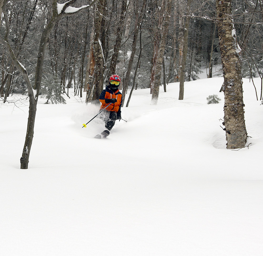 Dylan and I headed up to Bolton Valley this afternoon for a quick New Year’s Eve ski tour. Based on my observations from yesterday’s outing, I knew that despite exposed areas being wind-scoured, many trails at Timberline were holding some great powder. There were still resort visitors parking down at the Timberline lots, and while most had left by the time we arrived, there were still a few folks trickling down either by bus or via the trails.
