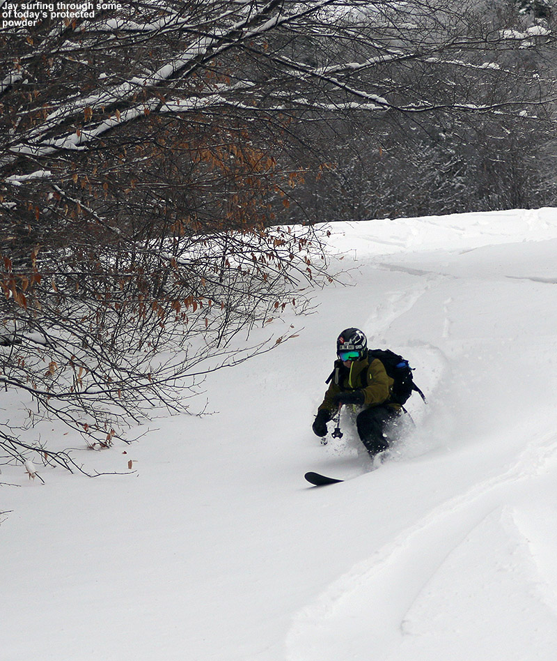 There were on and off periods of snow throughout the afternoon at the mountain, and Ty and I worked our way over from the Gondola to the Fourrunner Quad trails around Tyro with a dip into the Chapel Glades. The snow surfaces were excellent in there, and there were plenty of spots with fresh tracks to be had. We continued all the way down into the Toll House terrain because we were looking for something mellow, and I’d say there has certainly been plenty of visitation to the mountain over the past couple of days based on some of the areas I saw with tracks in them. You typically don’t find too many people spending much time in the trees around the Toll House Lift, since the terrain is very low angle and the return to the rest of the resort exceedingly long on the slow double. I’ve never seen as many tracks in there as I did today though, and we’re not talking a week after a storm, we’re talking a day or two after a storm. It was unusual, but hopefully a lot of beginners got their chance to check out the awesome powder in the trees!