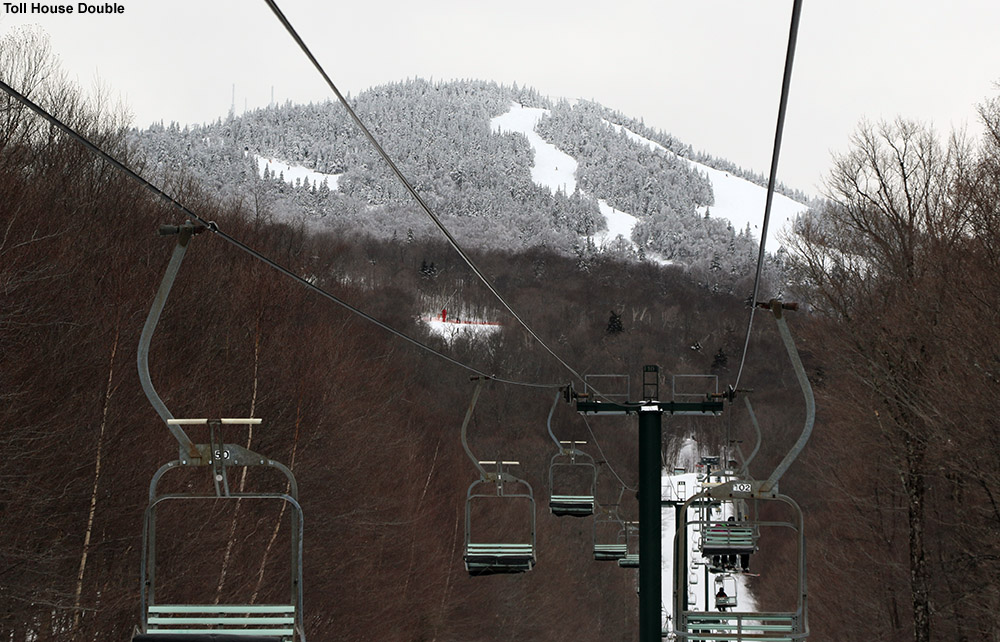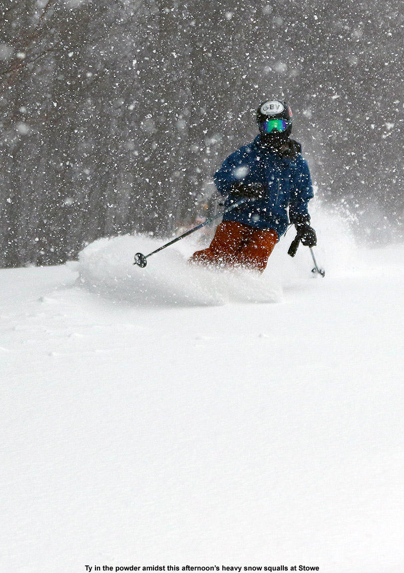 We made our way back to Spruce Peak for a final couple of runs of visiting some of our favorite powder stashes, and that last hour before closing definitely featured some of the heaviest snowfall of the day. I’m sure rates were an inch per hour or more at that point, and the photography was difficult during the heavy stuff, but we still fired away. Images captured successfully during intense snowfall are always fun anyway. In general I’d say we found about a foot of powder around the mountain in untracked areas, and the skiing was great. The quality of the powder was definitely very high, and it looks like it will stay that way with the upcoming forecast for the next week or so.