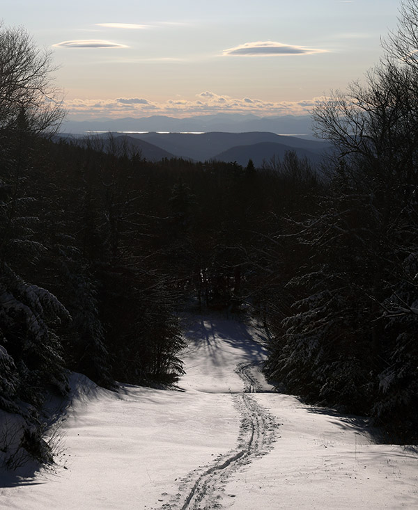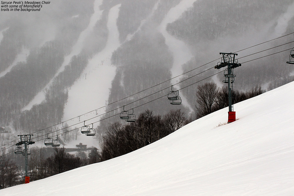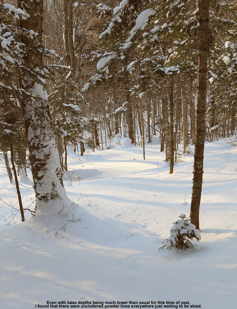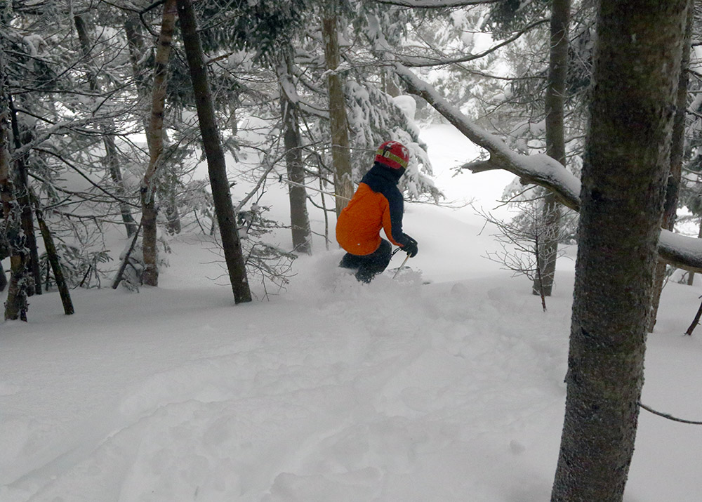 The Gondola and Fourrunner Quad were both on wind hold due to the strong gusts associated with the storm at elevation, so we started the afternoon off with a Sunny Spruce run to get a feel for the conditions. We found the edges of the runs quite good in some areas where the new snow was either untouched, or skiers had pushed the excess from the trails there. I decided to bring the group across to Mansfield to ride the Mountain Triple Chair where I expected to find that type of snow on trails like Tyro, and indeed we found some of that smooth snow and had some fun runs. The biggest hassle of the day was some freezing drizzle that would frequently crust up one’s goggles and reduce visibility, but fortunately it wasn’t really affecting the quality of the snow surfaces.
