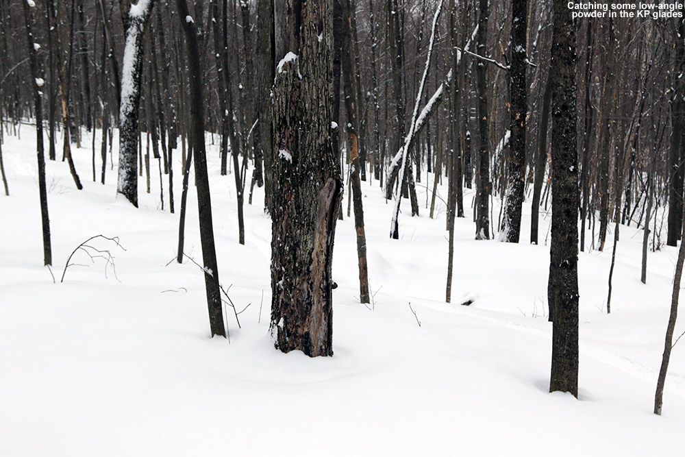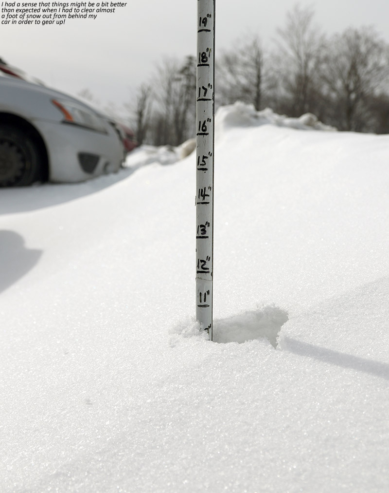 Snow conditions were bolstered significantly by a couple of dense inches of sleet and snow that had fallen by the time we arrived around midday. There was definitely a good shot of liquid in those couple of inches, and it helped to keep you off the subsurface in some areas, but the firm surface below definitely made its presence known.
