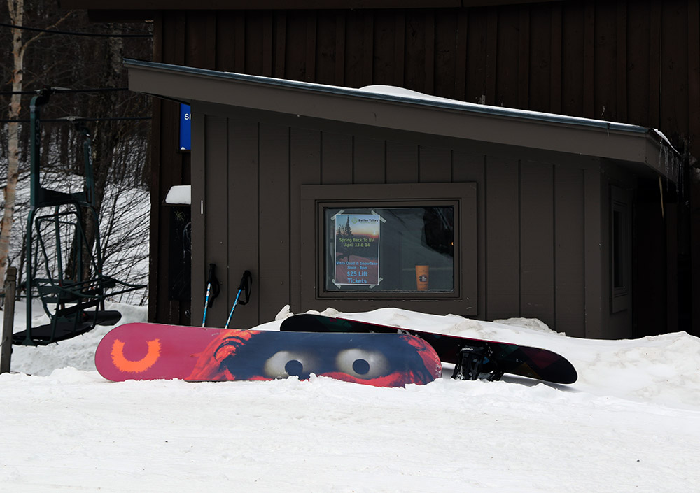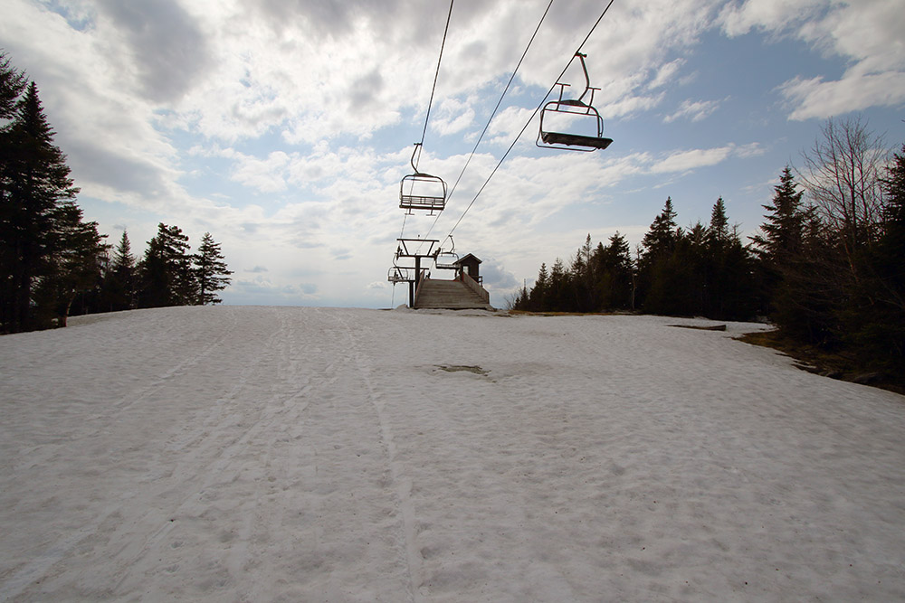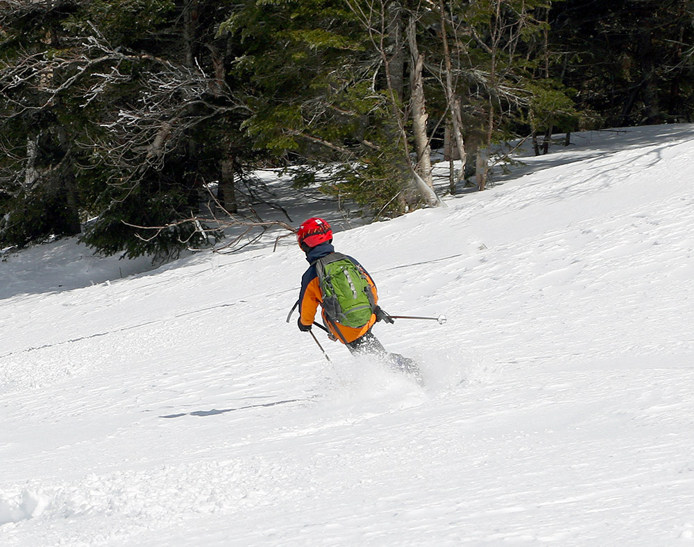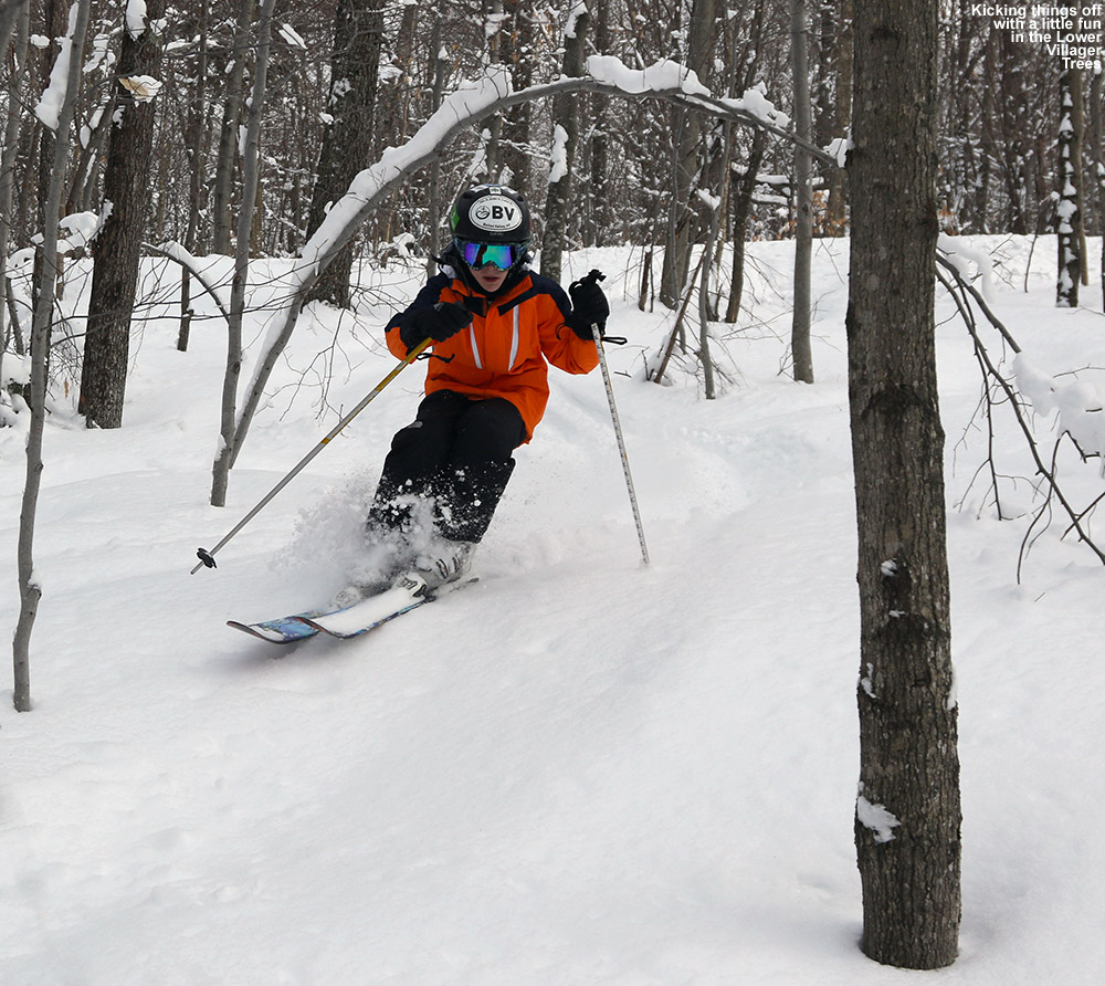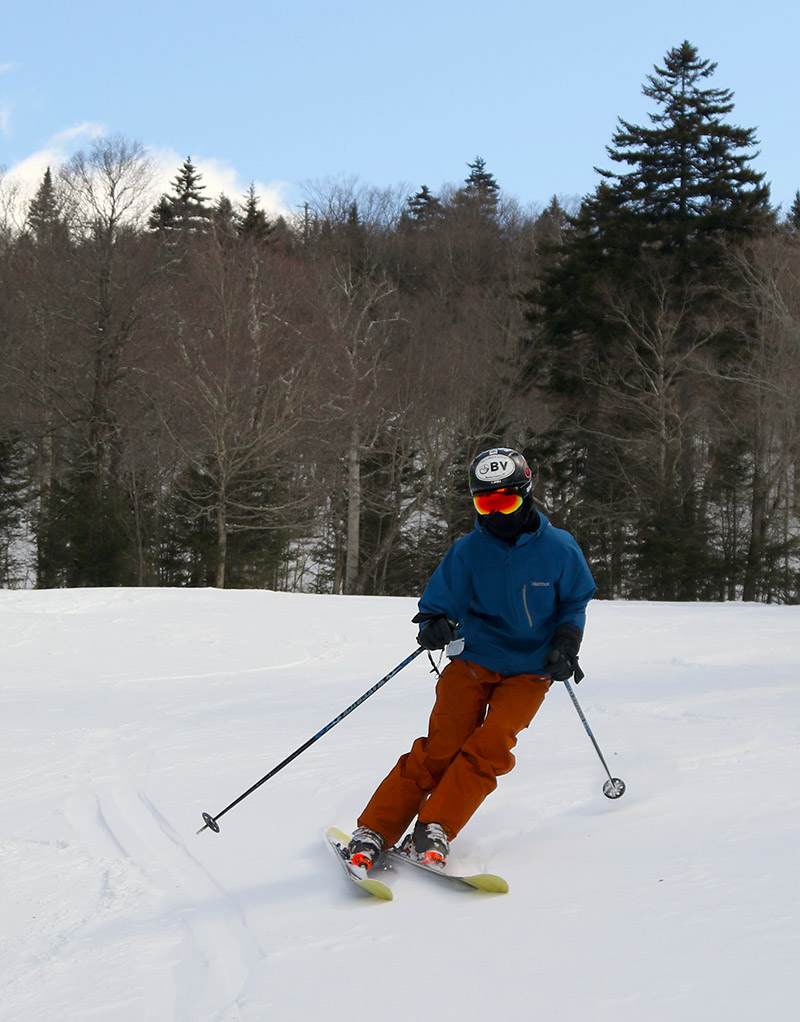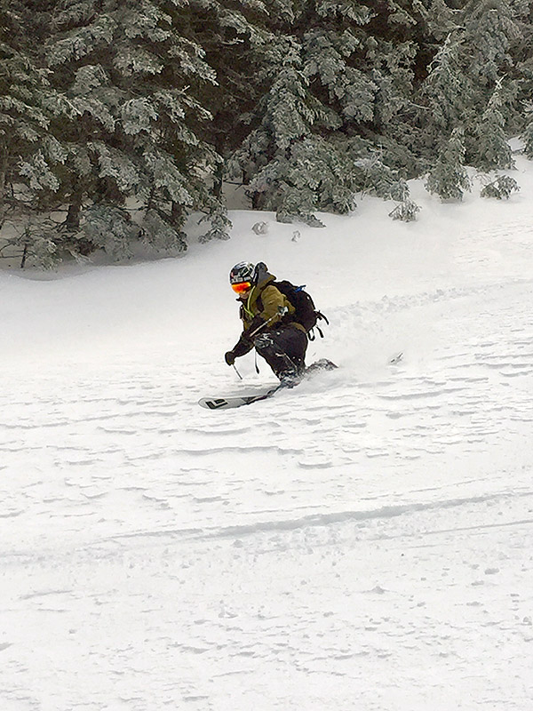 Although it can’t compare to the drier snow we had with last weekend’s storm, the turns were actually pretty sweet today. I could tell right away as I began my descent that the density and consistency of the snow called for steep terrain, so I dove right down Spillway and that really hit the spot. Even with 115 mm fat skis I was still touching the subsurface at times, but this snow was definitely dense enough to hold up pretty well on steep, aggressive turns. I stuck with Beech Seal on the lower half of the mountain, and the pitch there was also quite sufficient for a lot of good turns.