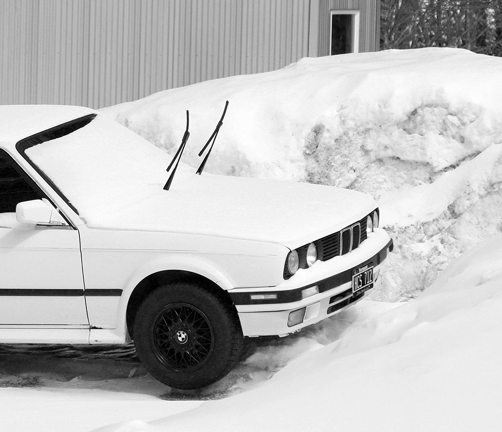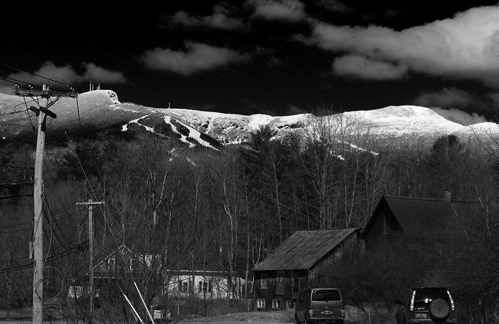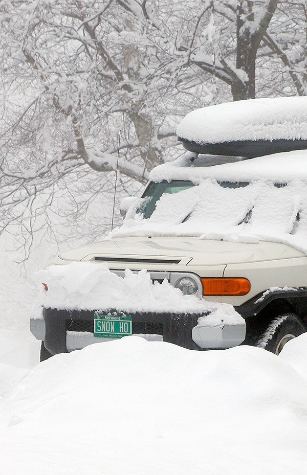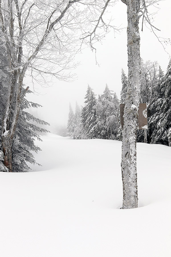 Low clouds were obscuring the mountains by our house, but it seemed like the snow line this morning was down around 1,000’. On my drive, the first signs of fresh snow accumulations were indeed right around the 1,000’ elevation on the Bolton Valley Access Road, and then the world just got whiter and whiter as I headed up.
