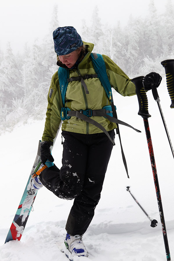 I started my ski tour at the Bolton Valley Village, which is a bit above 2,000’, so with the way this storm accumulated that meant decent coverage from there on up to the summits. At the base elevations this morning the temperature was just edging above freezing in the 7:30 -8:00 A.M. timeframe, and the snow was definitely dense. The fresh snow was wet, but not slushy or sopping at that point. It was gradually falling of the trees on my ascent as the temperatures rose. I headed up into cooler temperatures, but it was still warming all the way to the summit and I bet temperatures in the mid-30s F tracked with me as I ascended.