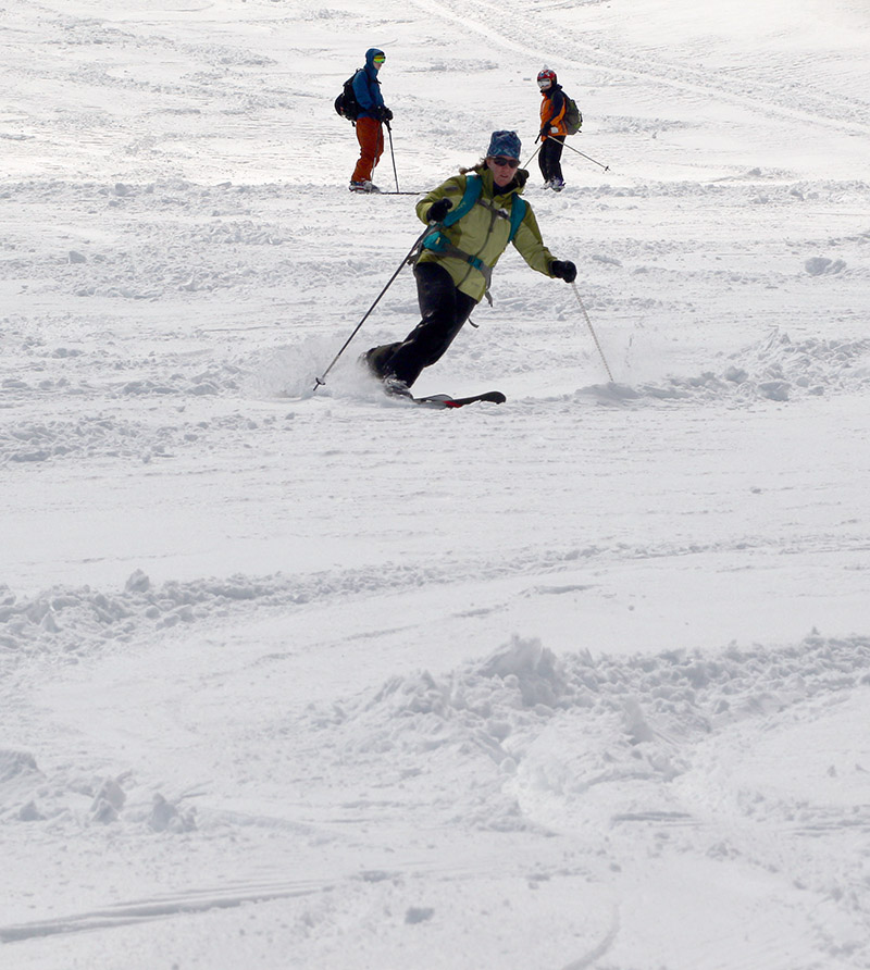 “Even with 115 mm fat skis I was still touching the subsurface at times, but this snow was definitely dense enough to hold up pretty well on steep, aggressive turns.”