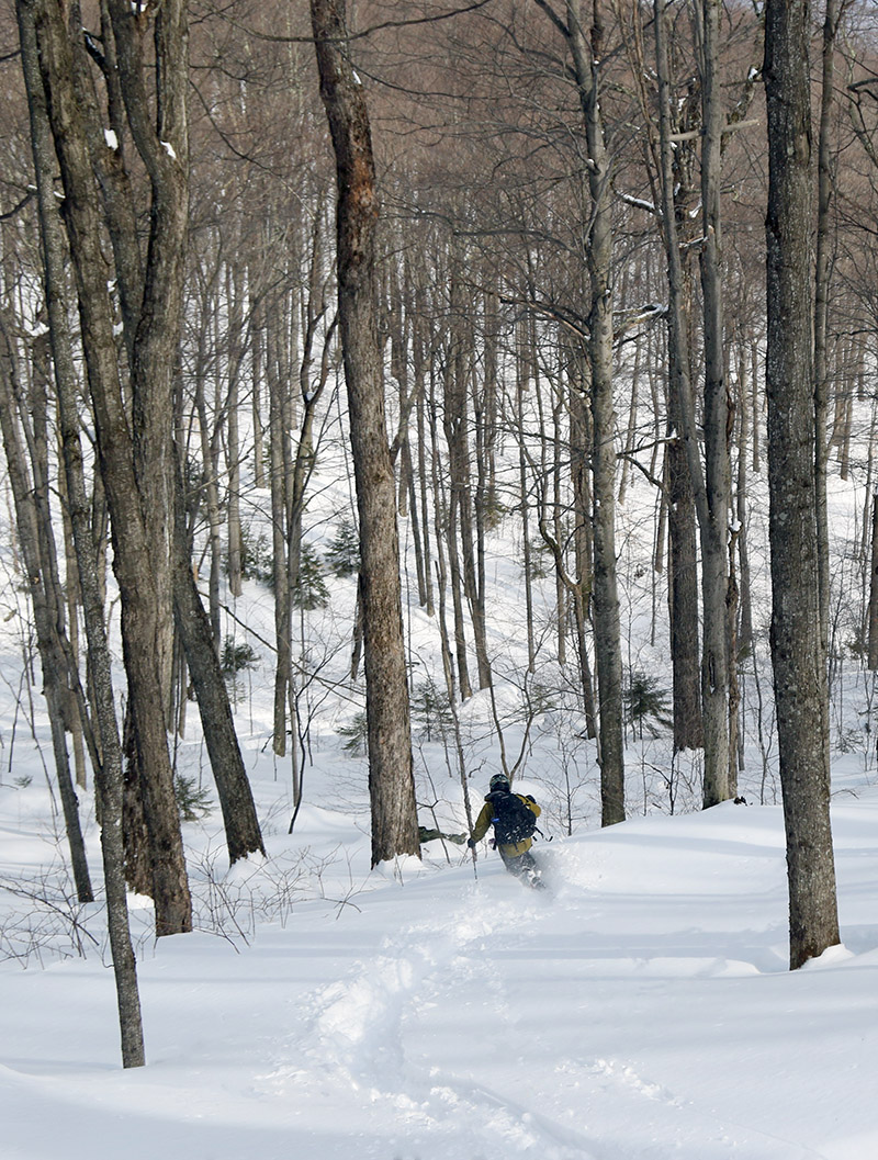 My time was limited for yesterday’s ski tour on Mt. Mansfield, so I only got to try out a portion of the skiing that Stowe’s Liftline trail had to offer. Based on the intel I’d received from Jumpin’ Jimmy though, it sounded like some of the best skiing was in that big upper section of snow on the trail, suggesting that another visit was in order. I had some time today ahead of the rain that was expected to move in during the afternoon, so off to the mountain I went.