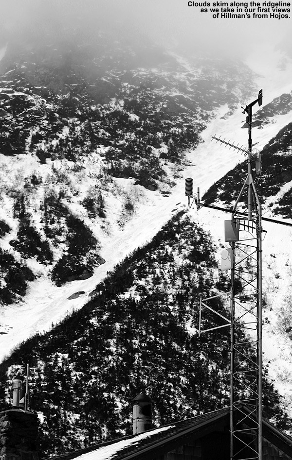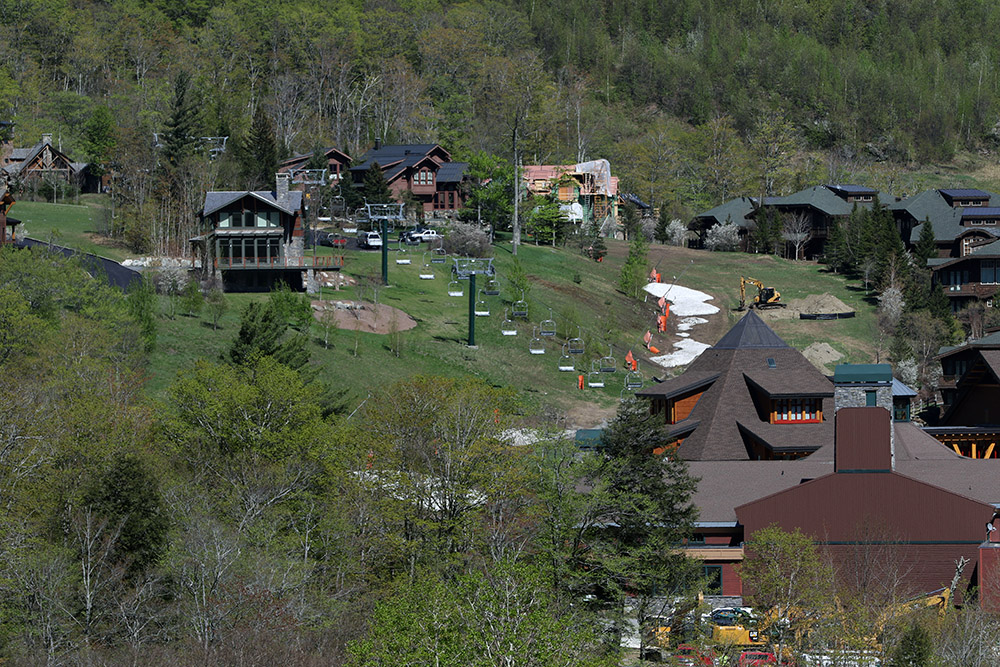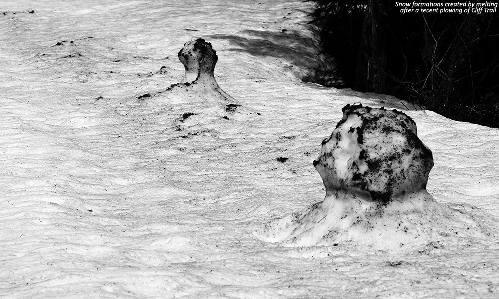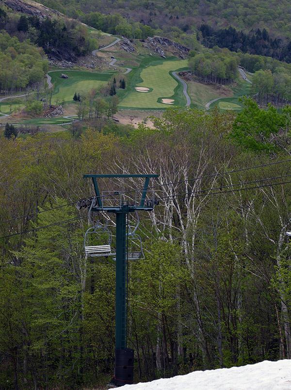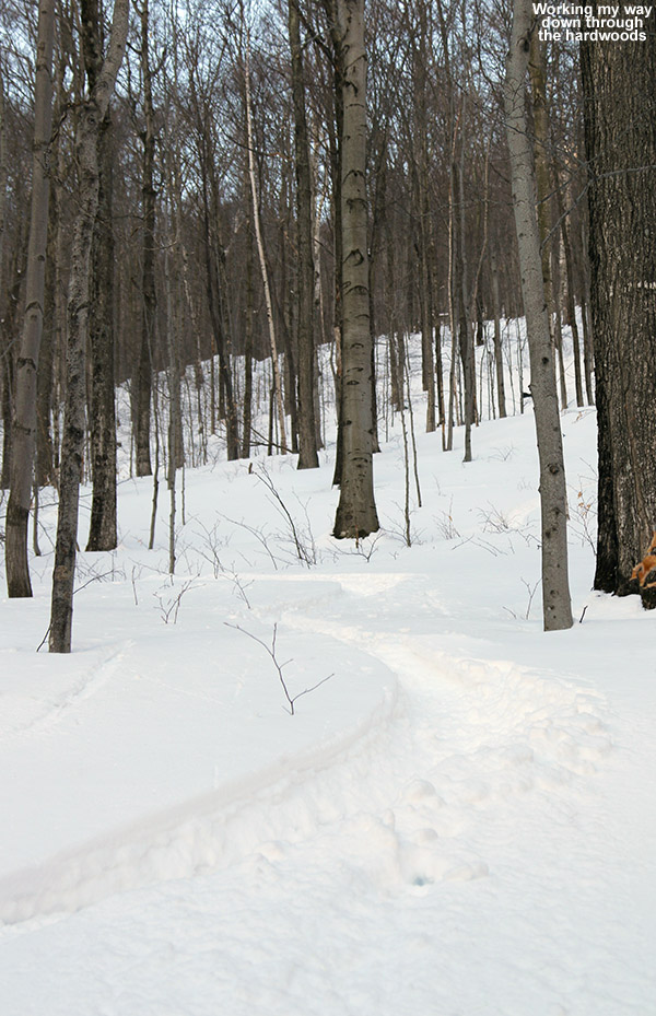 Yesterday gave me a great sense for the available snow at the resort, so I parked right near the mountain operations building below Sepp’s Run, knowing that I’d be finishing my tour there. I ascended Liftline yesterday through a combination of skinning and hiking, but the skinning was pretty challenging on some of the steeper, narrower pitches, so I wanted to try a different ascent route today. I took a gradual ascent toward the North Slope route via Lower Starr and Crossover, enjoying nice dry grass and easy walking. Using various combinations of trails in the North Slope area, I was able to put on my skins around 2,800’, and had to take them off a couple more times before reaching the top of the Fourrunner Quad.