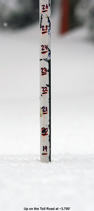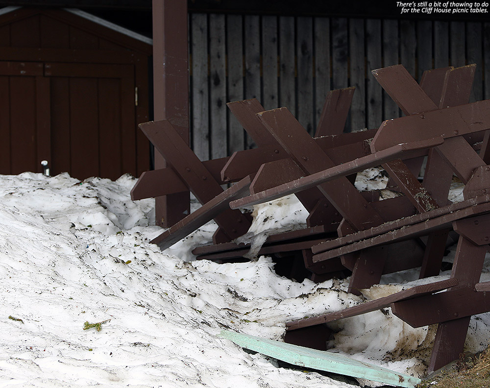For the descent, the main breaks in the snowpack are right at the Liftline headwall, and then about halfway down the trail before you get to the terrain I skied yesterday. Indeed the turns on the upper parts of Liftline were great – there’s a lot of snow up there on skier’s left, and plenty of terrain variety. All told you’re probably looking at around 85% snow for a trip down from the top of the Fourrunner Quad, so it’s certainly still worth it if you’re looking for some good spring turns.