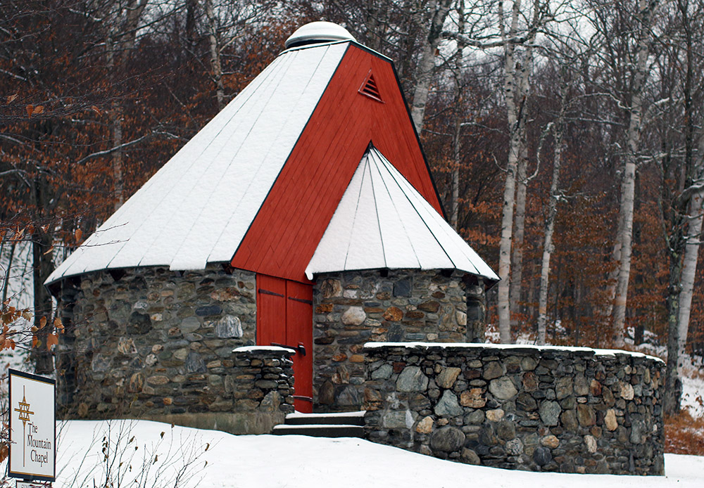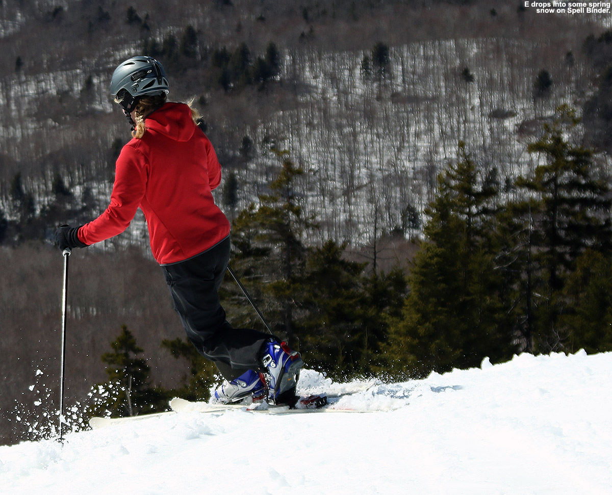 I wanted some mellow, grassy slopes for my tour, so I headed up in the area of the Mountain Triple Chair toward the Stowe Mountain Chapel. The mixed precipitation that I’d found when I first arrived changed over to all snow as I began my ascent, and I really needed the hood of my coat at times due to the intensity of the precipitation. I quickly found 3 to 4 inches of snow on the grassy slopes, which is about where the depth stayed up to the Mountain Chapel at ~2,300’. Although I could have used my skins, I never really needed them because once I got up to the Crossover road I was able to simply walk in my Tele boots easily.