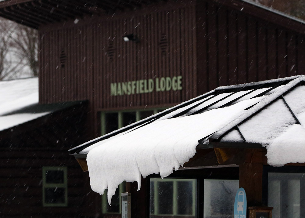 In line with my plans, I next headed off to Stowe for some skiing, and I was fairly confident that the driving would be fine with the route at mostly low elevation. Indeed the driving was fine, and unlike Waterbury, the town of Stowe really hadn’t picked up any snow, so that made the drive very easy. Rain through the valley switched to mixed precipitation as I approached the base elevations of the resort at 1,500’, and I found a solid covering of 1 to 2 inches of snow on the ground at the Mansfield Base Lodge where I parked. I’d brought two pairs of skis and skins, and after surveilling the area I decided that the rock skis were the way to go for a more enjoyable descent because I wouldn’t have to work too hard trying to avoid any rocks.