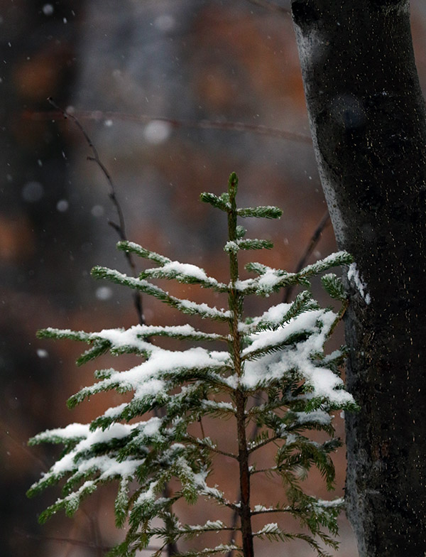 As the nor’easter approached, snowfall at our house in Waterbury began mid-morning, and then in the midafternoon Mother Nature really turned on the spigot and we got into a period of heavy snowfall composed of big wet flakes up to 2 inches in diameter. With the heavy snow falling it seemed like as good a time as any with respect to catching any new accumulations on the slopes before any potential mixed precipitation. I was planning to take an initial look at Bolton Valley to see how the snow was up there, but the Bolton Valley Access Road still hadn’t been plowed as I started up, so I didn’t go very high before I decided it was best to turn around. There was no way I wanted to try heading all the way up to the Village above 2,000’ on an unplowed road.