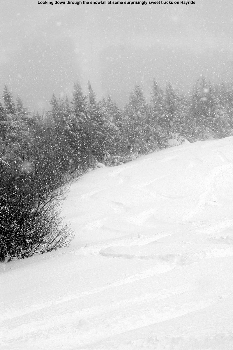 With the intensity of the snowfall at our house yesterday evening, it was pretty clear the mountains would have at least a few inches of new snow, so I planned to catch some turns in the morning. When I checked the Bolton Valley snow report this morning, I was sort of surprised to see the mountain only reporting 4 inches of new snow, especially since we’d already picked up about 5 inches down at the house. I figured that they might have missed out on some of the snow because it was blowing downwind of the Green Mountain Spine, but after touring around at the resort today, I can say that definitely wasn’t the case.