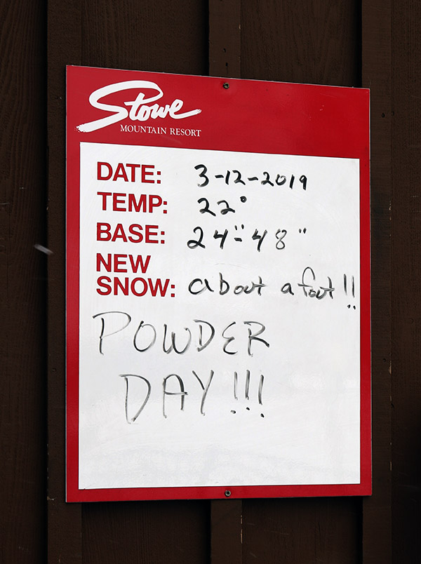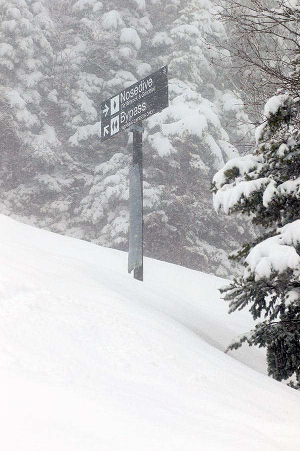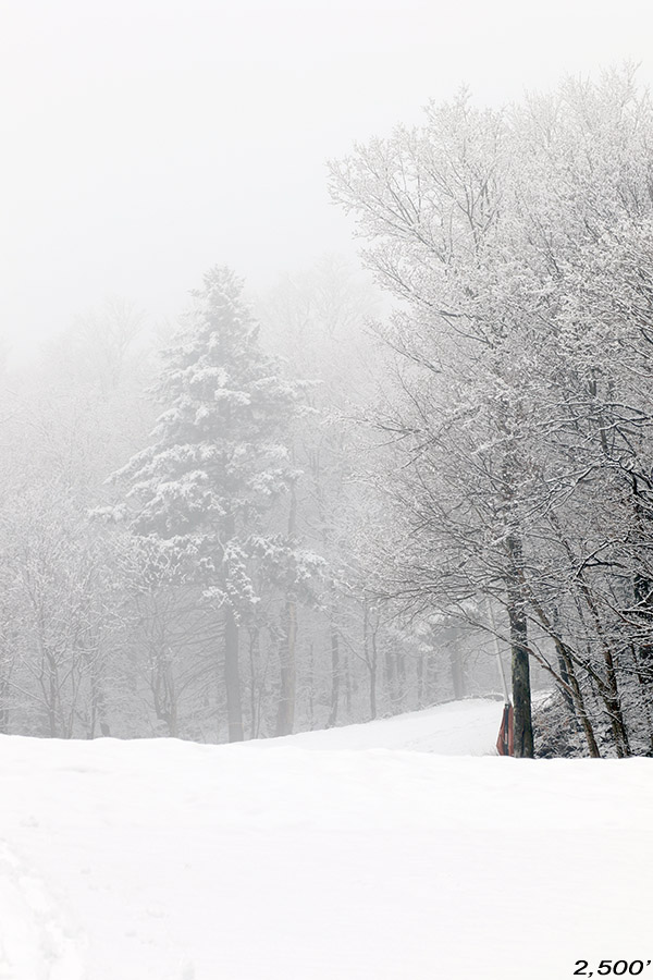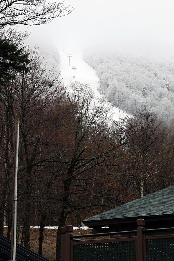 On the drive up the Bolton Valley Access Road, the first signs of snow didn’t appear until about 1,500’ elevation near the base of the Timberline area. I was surprised to see that there were even skiable lines farther up on Timberline. Up at the main mountain, snowpack starts right at the base.