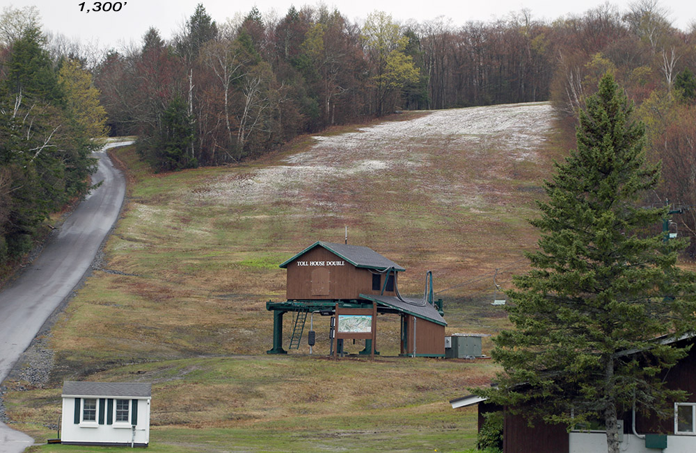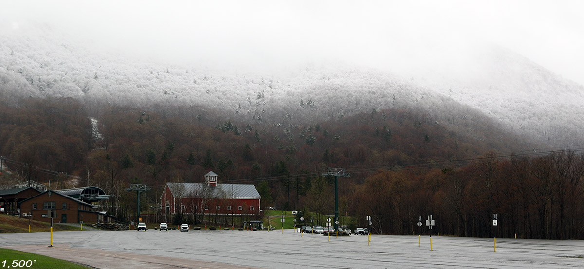 As I approached the mountain today, the first signs of fresh snow were at around 1,300′ just above the base of the Toll House Lift.