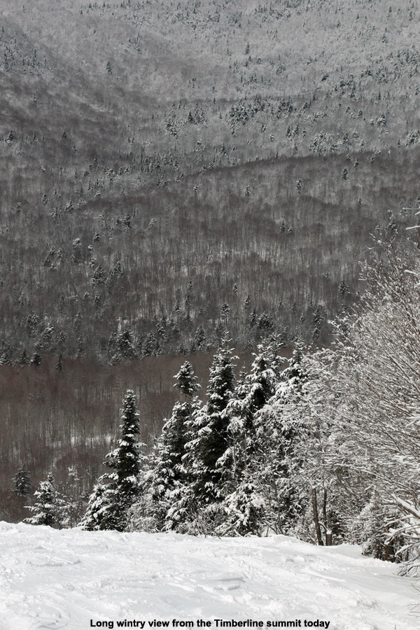 Although we did have some reports of frozen precipitation around the area back in the beginning of the month, the bombing cyclone that’s moved through New England over the past couple of days has brought the first real snows of the season to the Green Mountains. As the system moved by yesterday, the summit areas of Killington picked up an inch or two of snow. There wasn’t much going on with respect to snowfall in the northern part of Vermont at that point, but snow levels finally dropped overnight and we started to see accumulations in the higher elevations around here. Although I wasn’t out in the mountains today, the view from my office in Burlington showed that classic look of upslope precipitation along the spine of the Northern Greens. A quick check on the local radar showed that classic signature of moisture streaming into the spine of the Greens, with snow and mixed precipitation along the peaks. Powderfreak sent in pictures to the Northern New England thread at the American Weather Forums, revealing snow accumulations down to roughly 2,400’ at the Gondola, and a couple of inches of accumulation at the top of the Fourrunner Quad. At the end of the day, Powderfreak passed along one more photo that showed accumulating snow levels at around 2,300’ at the Gondola, and commented on how snow levels were somewhat lower on that part of the mountain below The Chin. Winter’s first salvo of snow is now in the books, and we may see a bit more near the end of the month based on what the weather models are showing for that period.