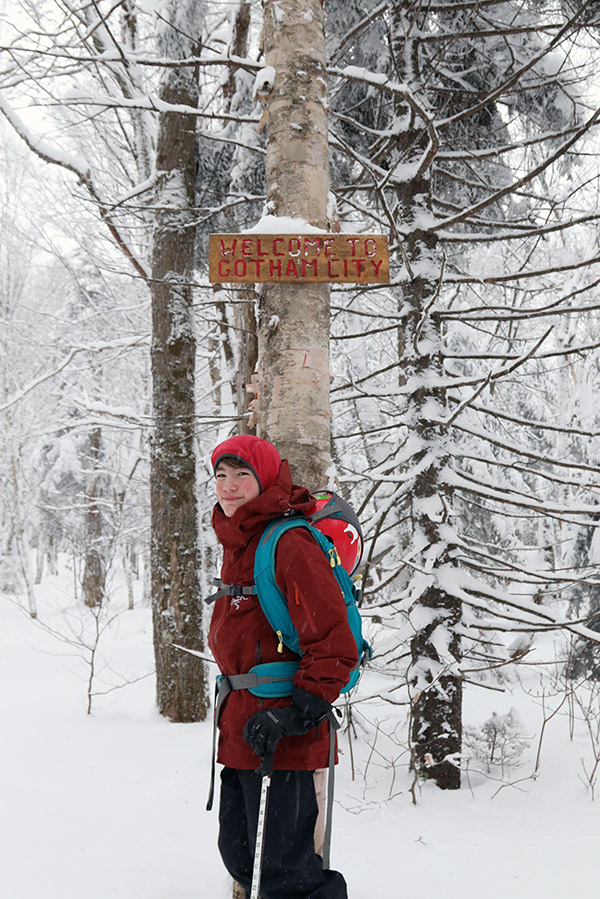 We’ve actually got our next significant weather system, Winter Storm Jacob, starting to affect the area this afternoon. I’m not sure exactly when the snow from the storm first started to appear, but around 4:00 P.M. we were in Gotham City finishing our ascent, and I realized it was snowing. It’s kind of fun when you’re touring in the forest like that with limited views and protection from the elements, and before you know it you’re getting covered with fresh snow. The density of snow from this next storm will probably be on the high side, so it should make a solid contribution to the base to cover some of the obstacles we’ve been encountering.