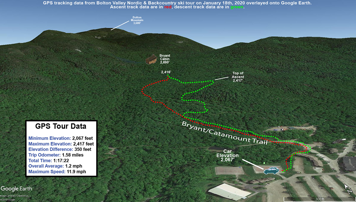 A Google Earth map with GPS tracking data of today’s tour on the Bolton Valley backcountry network