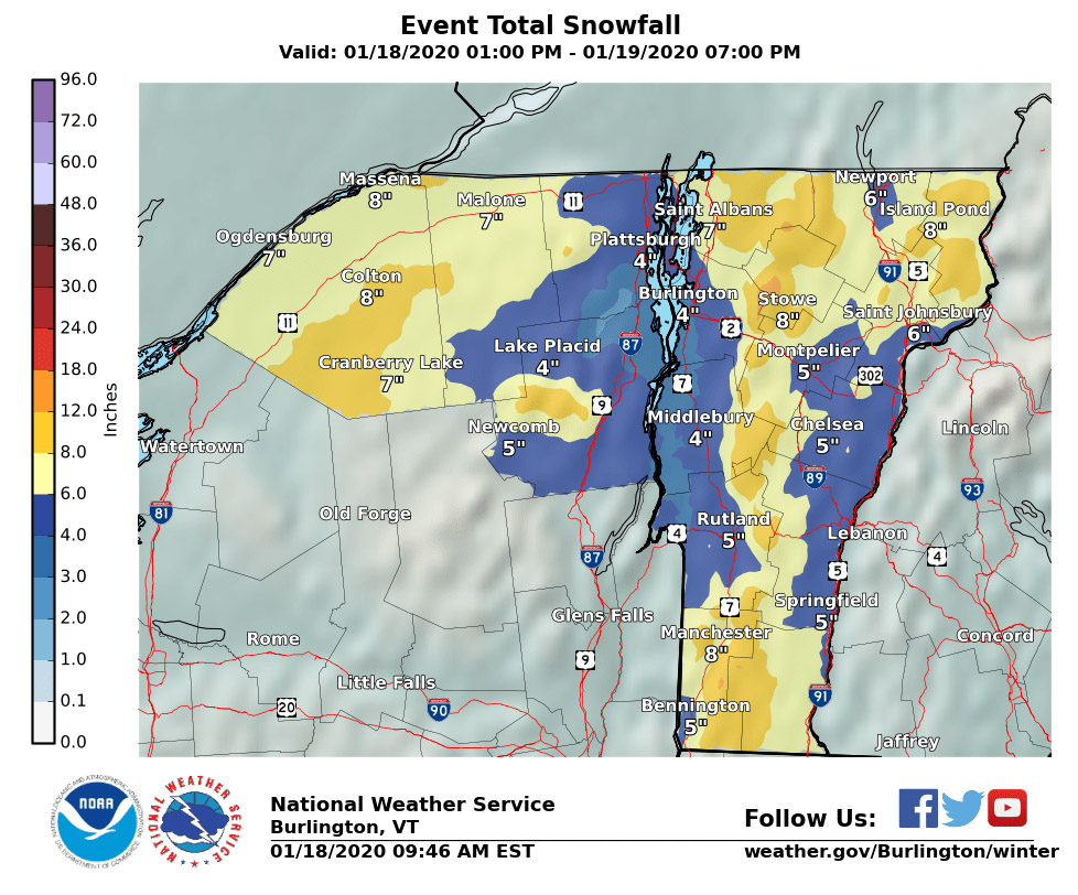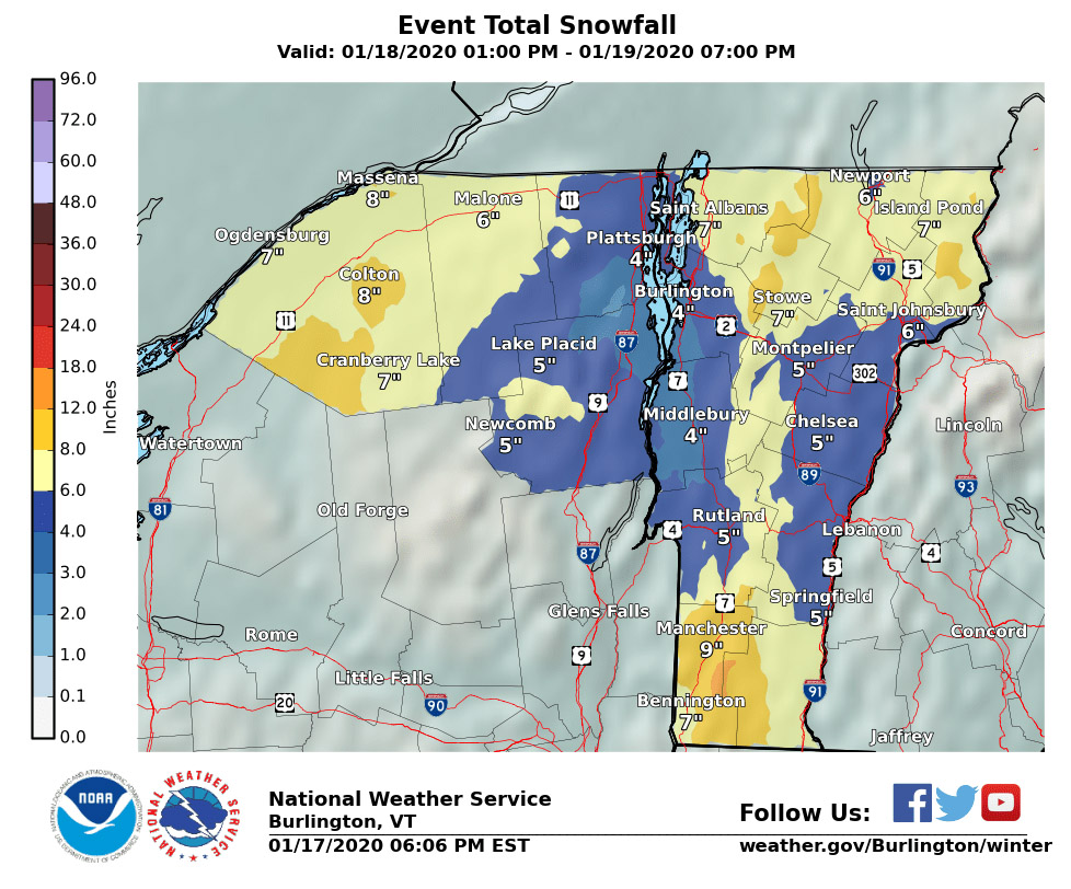 The snow from Winter Storm Jacob began yesterday while Dylan and I were out on the Bolton Valley Backcountry Network, and the intensity continued to ramp up while we finished our tour. The winds increased and flakes were flying while we packed up our gear at the car, and I definitely had to take it easy coming back down the Bolton Valley Access Road with the accumulating snow. The snow was falling in the form of relatively small flakes, so the accumulations were coming in quite dense. By morning, Bolton Valley was reporting 5 inches of new snow with more to come during the day.