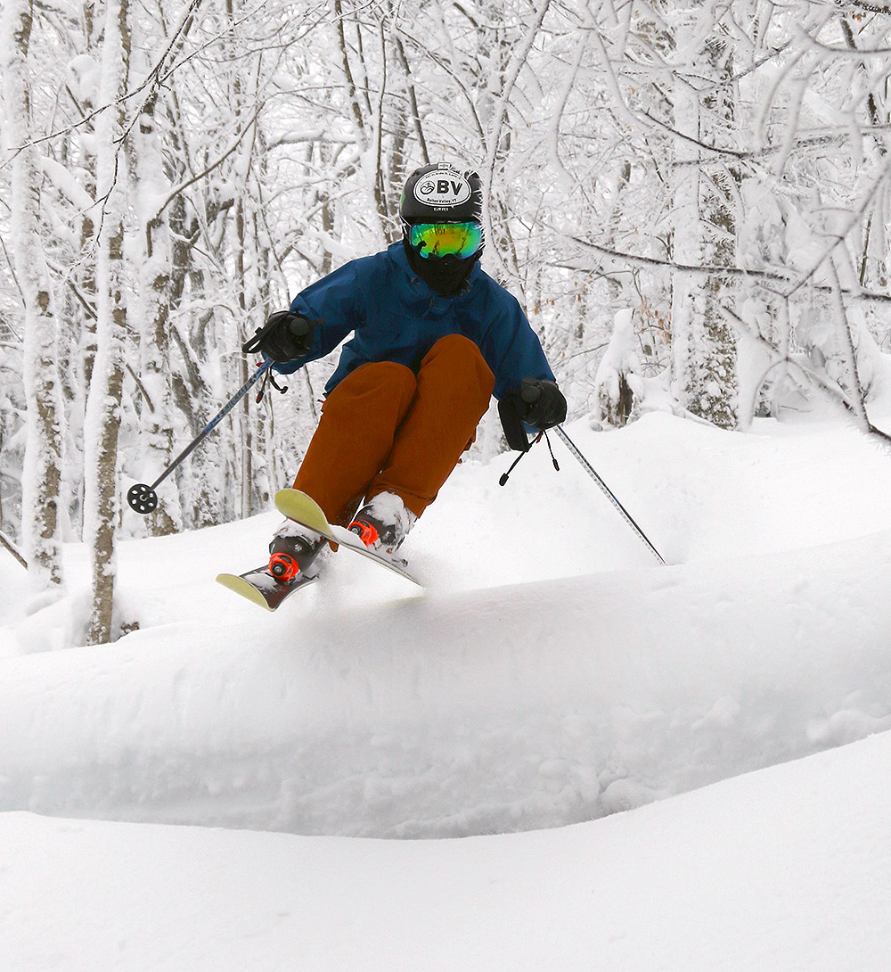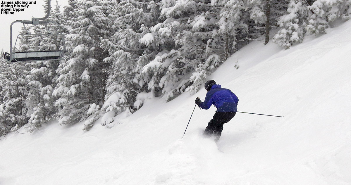 The turns we had today were very nice. The powder was of medium to perhaps slightly higher density, and temperatures were well below freezing even in the Village at 2,000’. The snow had a nice surfy consistency, with enough buoyancy for bottomless turns on even steep pitches in the black diamond range. You could certainly hit bottom on the very steepest pitches, but we focused on medium-angle terrain and it was bottomless all the way.