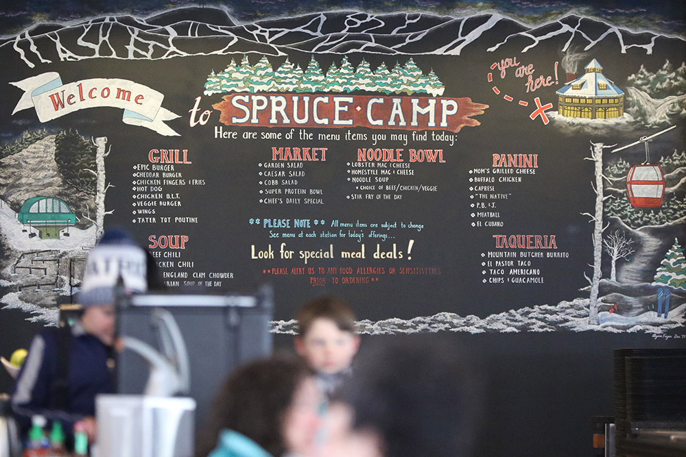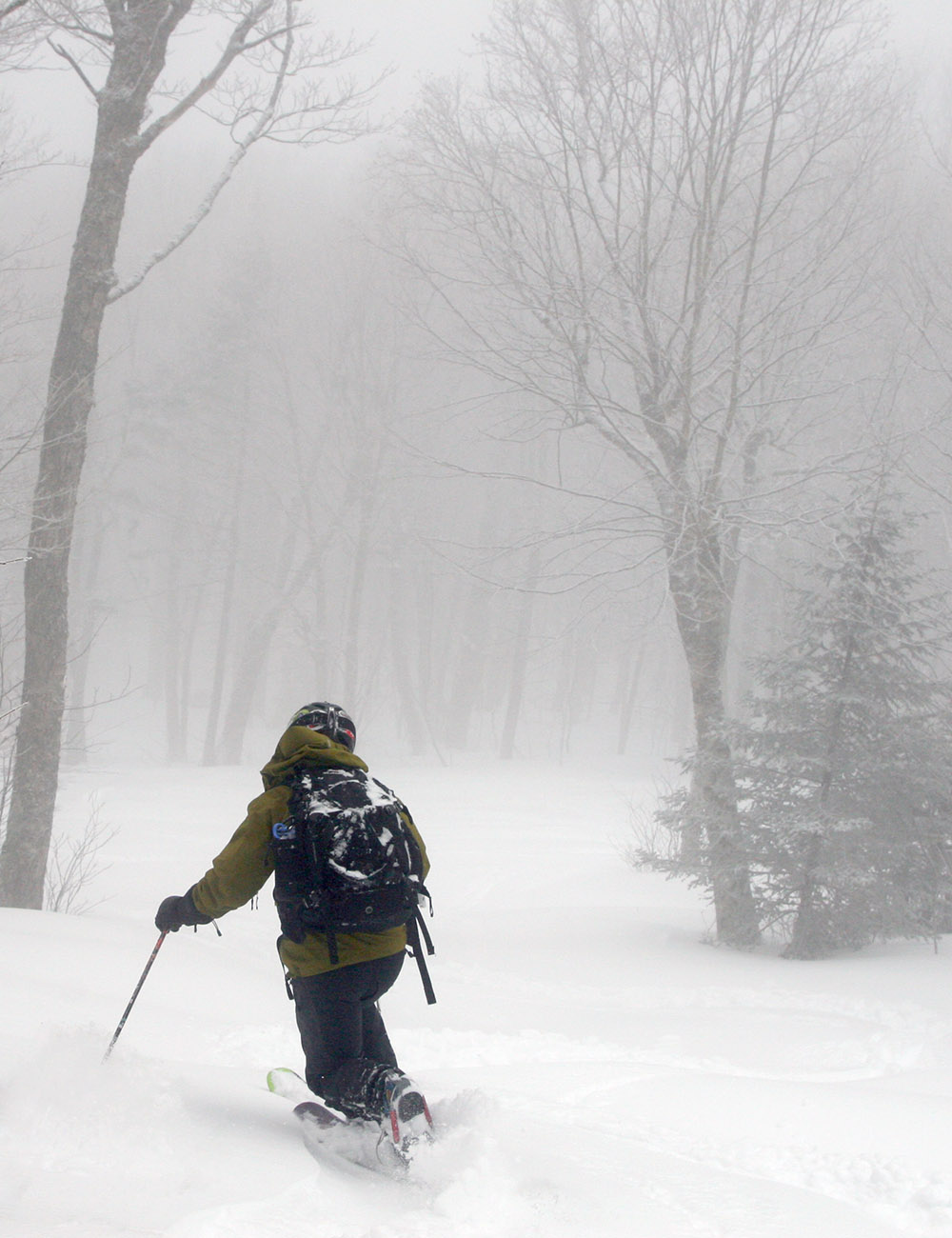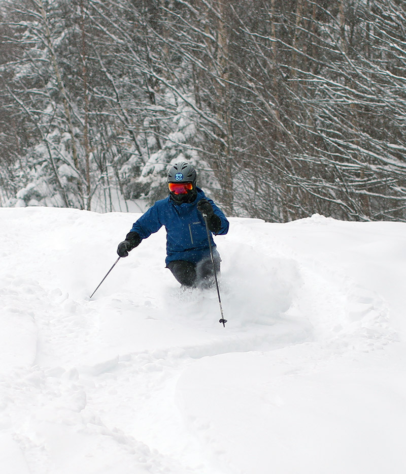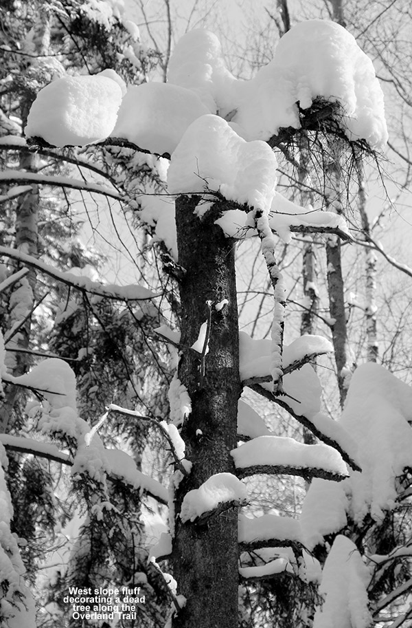 Since the resort is not posting snow reports now that they’re closed, we didn’t have a sense for how much snow Bolton Valley picked up in the storm, but Dylan and I finally had time around late morning to head up for a ski tour. On the way up the access road we stopped in at Timberline to check on the snow depth, and found about 7 inches of settled new accumulation at the base. We also noted that there were a couple dozen cars in the parking lot from folks that were out ski touring.