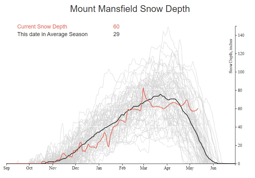 In the Bolton Valley area this morning, there were accumulations all the way down to the base of the access road at 340’, and the accumulations slowly increased as one headed up to the resort. The snow depths started to increase more rapidly around the elevation of the resort Village, with 3 to 4 inches there, and those totals doubled by the 2,500’ elevation. Essentially all the snow above 1,500’ was winter-dry, and temperatures were still in the 20s F this morning from probably 1,500’ on up. I’ll have to look back at all the April and May storms we’ve had this season, but this was some of the driest/wintriest snow I can recall in the past few storms.