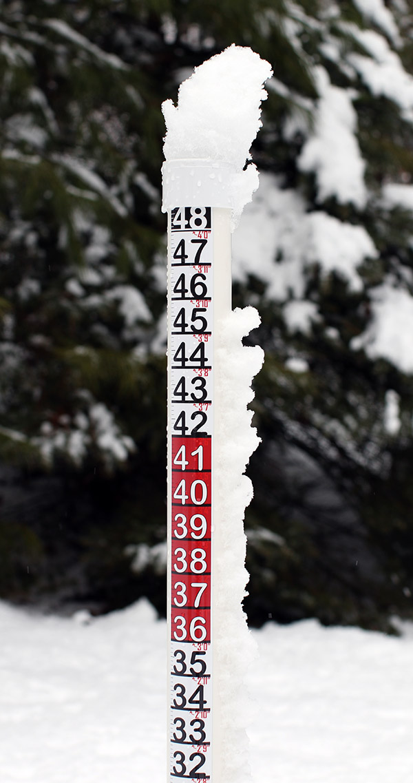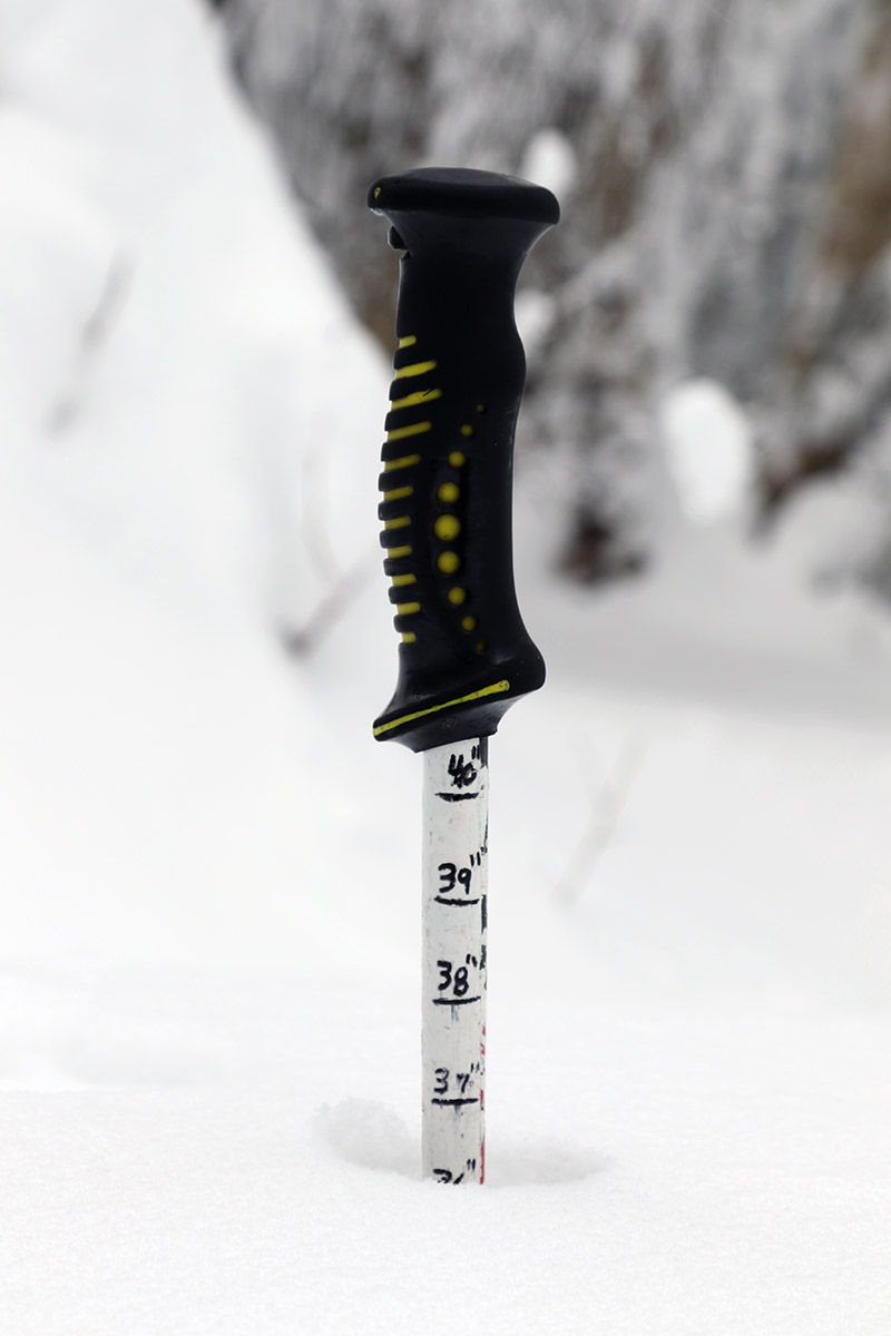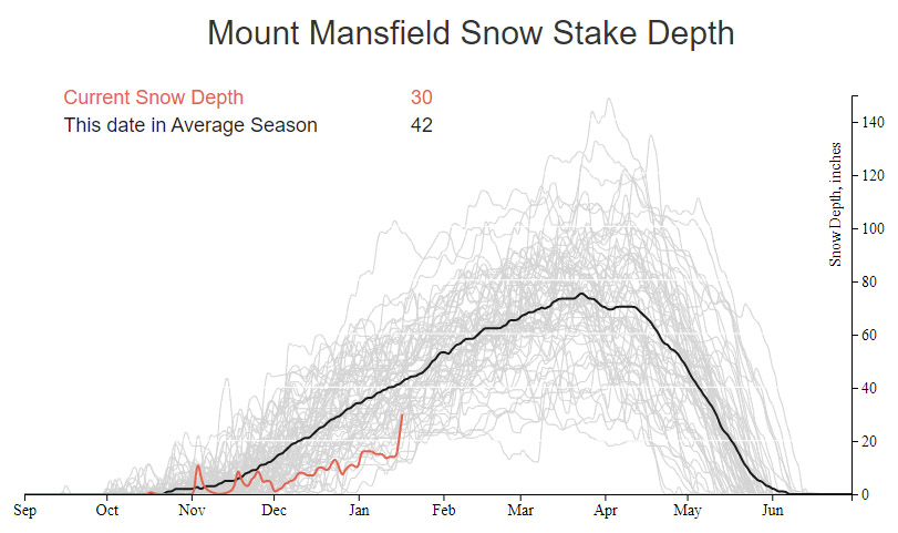 I made depth measurements of the snowpack during my tour, and I found generally 26-27” around the 2,000’ level, and many spots that are getting dangerously close to 40” up near 3,000’. That’s pretty consistent with what the Mt. Mansfield Stake is showing. The powder skiing was great, although we could still use another storm or two just to push the snowpack depth past that 40” benchmark.