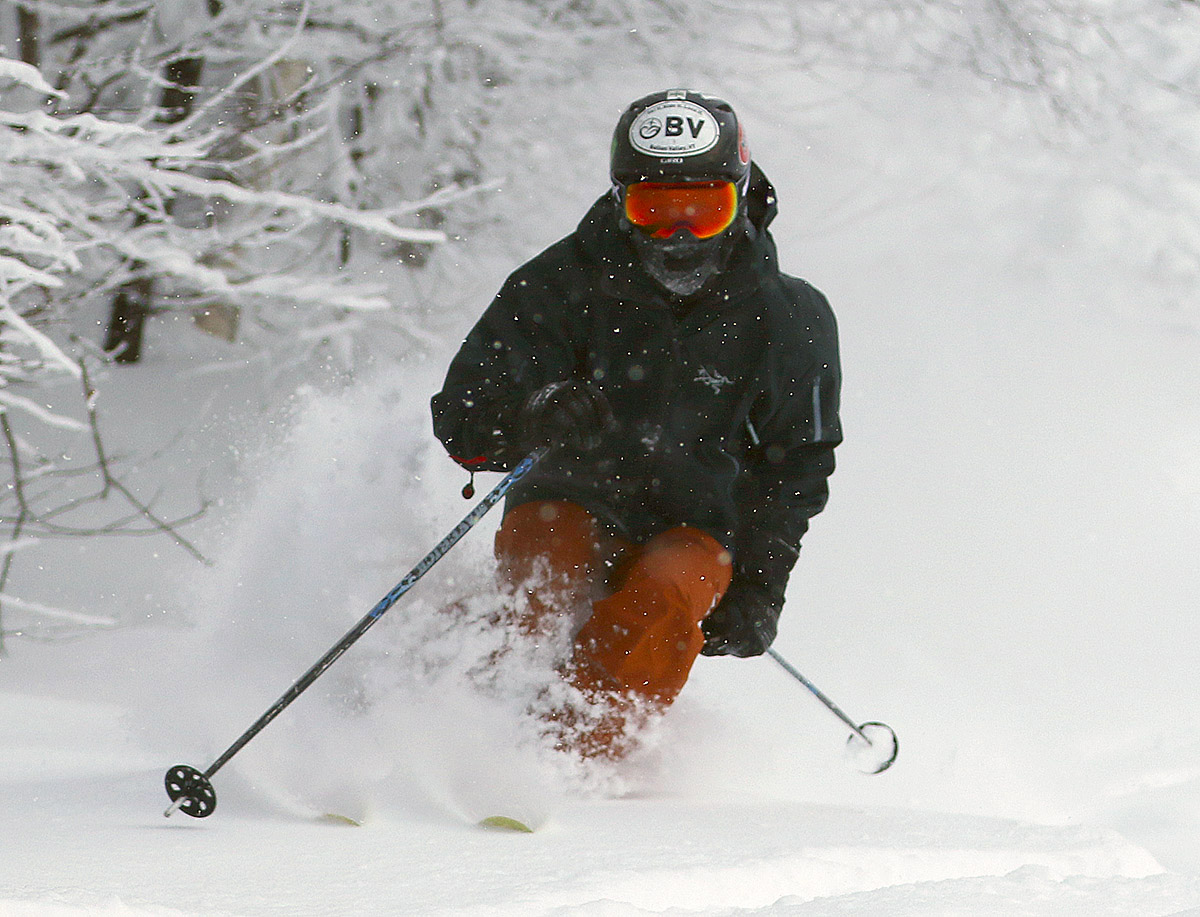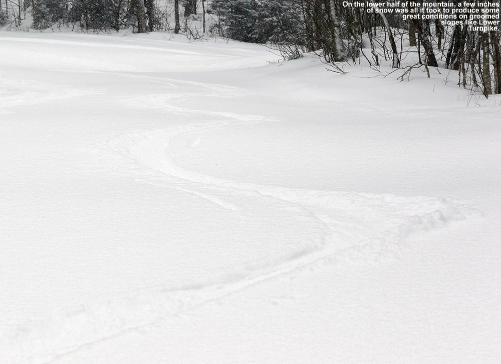 We’d already been planning to head back to the mountain today for an early morning start, since Bolton’s highest elevation lifts (Vista Quad and Wilderness Double) never ran yesterday due to high winds. They both ran fine today and delivered some great skiing on the upper mountain. Conditions already would have been great, but that extra 3-4” of sub-4% H2O champagne we picked up early this morning put the icing on the cake, and it continued to snow much of the morning on the mountain as well.