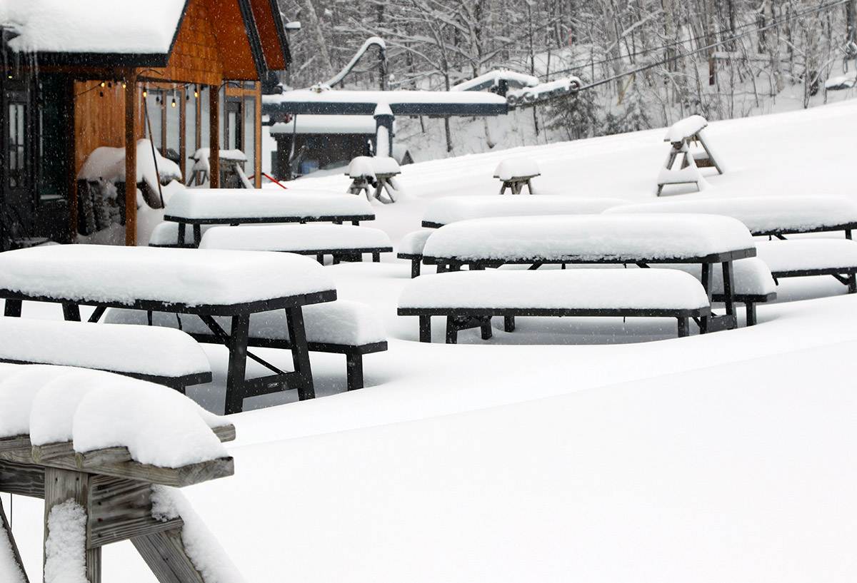 A view of the ski patrol hut at the Timberline Summit as the heavy snowfall pours down this morning at Bolton Valley