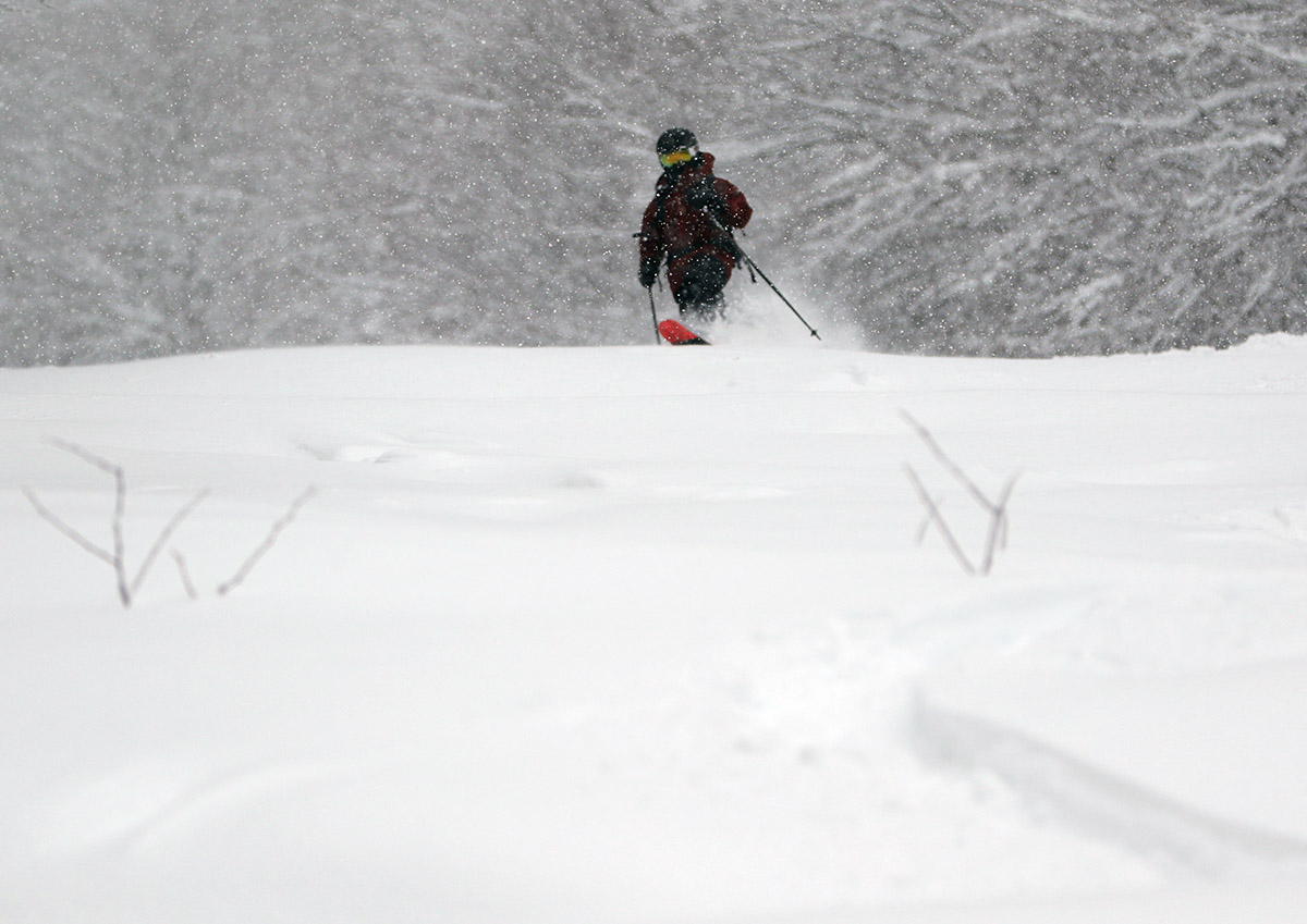My initial plan was to catch a couple of runs on my way to work for a meeting, and it was just dumping 1-2”/hr snowfall with ski conditions that were off the hook. It was the kind of snowfall where if you don’t move around much during the lift ride, you find a half inch of accumulation pouring off you when you disembark from the lift. Although there was no wind down at the base at 1,500’, up at 2,500’ there was a touch of wind, but nothing too serious – all around the mountain you could just see the upslope snow stacking up on everything. Even the deciduous branches were just loaded with snow, and it was too such a degree that you couldn’t see a thing through areas of the forest that normally let you catch glimpses of adjoining trails. The heavy snowfall helped to make everything intensely quiet; between the snow piled on the trees, the air filled with huge, fat flakes, and the ground covered with powder, sounds were muffled to almost nothing.
