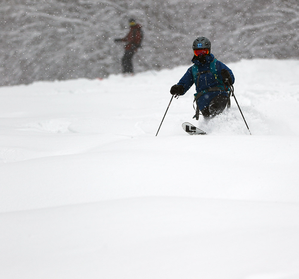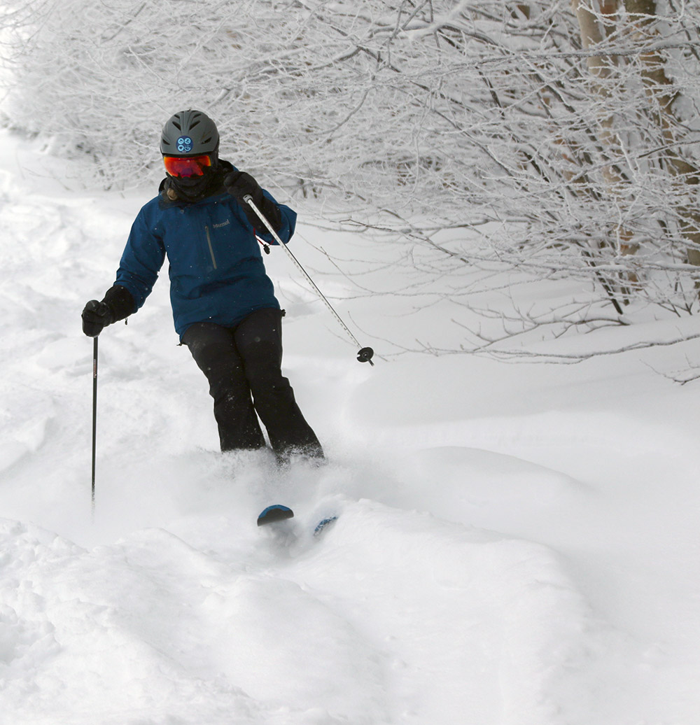 Snow from Winter Storm Malcolm continues to fall as Erica enjoys some morning Telemark turns on Twice as Nice.