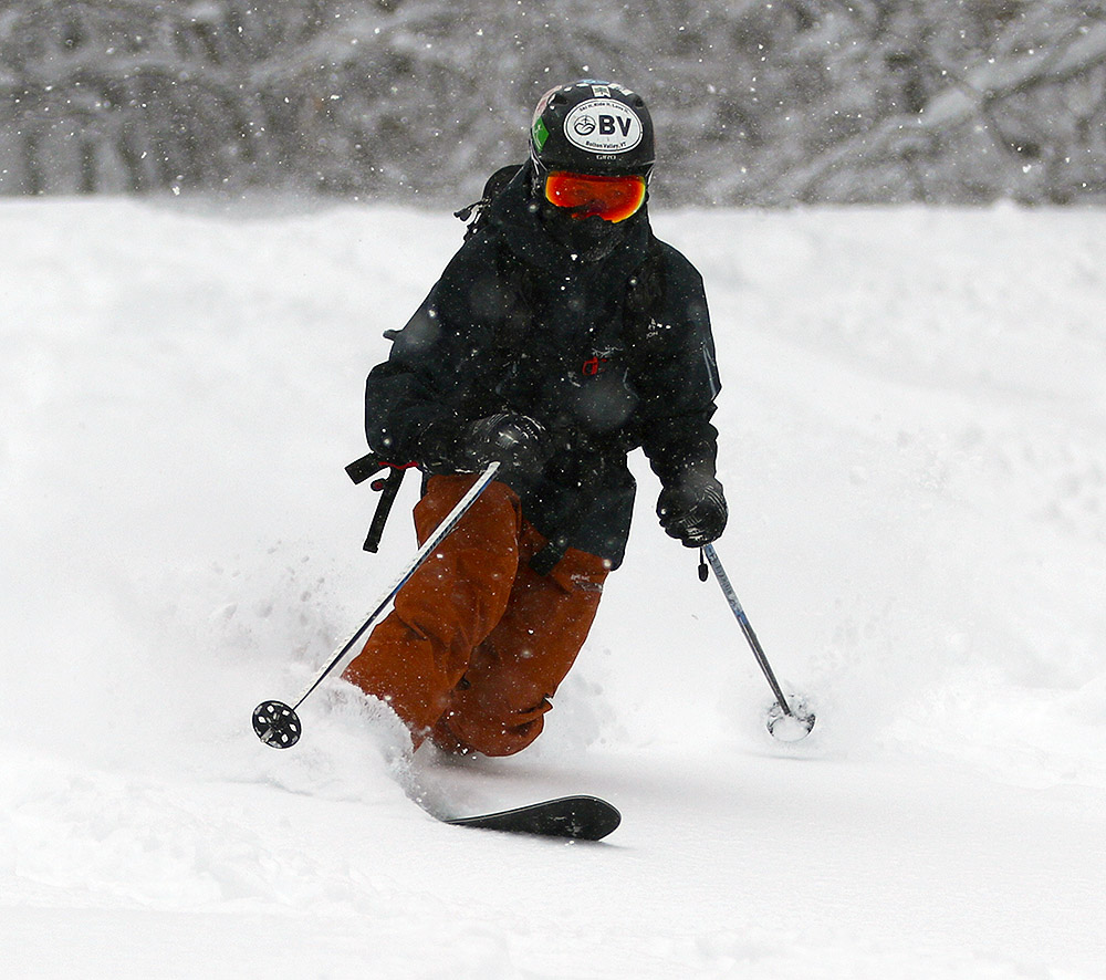 In terms of the snow, it was unquestionably dense down at 1,500’. I was actually happy with my choice to go with lift-served turns because I appreciated having some packed snow in places and the ability to wander off to the sides into the powder as desired. The powder would have been a bit easier on my fat skis, but on my midfat Teles it was definitely a workout staying for long periods in the deep, dense untracked snow. I was happy for some quick reprieves on the groomed areas. Groomed terrain was skiing very nicely – the packed snow was certainly dense, but not to the level of that slick, wet pack snow that can get rather grabby. The snow got substantially drier with elevation – in the top 500’ of vertical, say from the Vista Summit on down to 2,600’ or 2,700’, the snow was in a totally different league relative to the base. Jumping into untracked powder made for smooth, easy turns; the snow had just lost enough density that it just wasn’t pushing me around on my midfat Teles. Down below those elevations, the powder began to get a bit denser, but you could definitely give yourself and extra margin of comfort on a pair of alpine fat skis, or especially a snowboard.