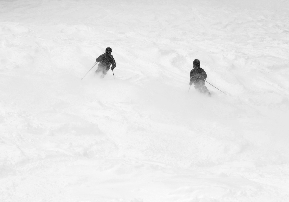 E amidst the powder and falling snow of Winter Storm Malcolm as she descends Hard Luck this morning.