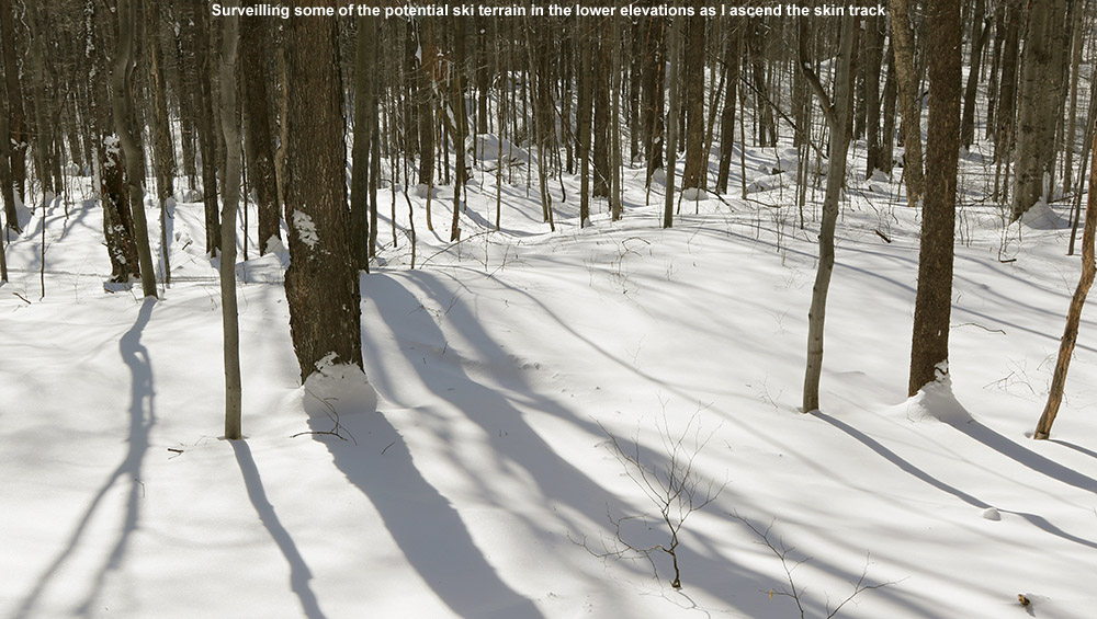 The consistent snows and temperatures we’ve had over the past several days had me pretty certain that the snow quality was there for lift-served skiing today, but the arctic hounds coming in on those northwest winds led me to go touring instead. When I saw projected highs in the single digits F for Bolton Valley today, there was no way I wanted to sit still on the lifts in the wind vs. generating my own heat down in the protection of the forest.