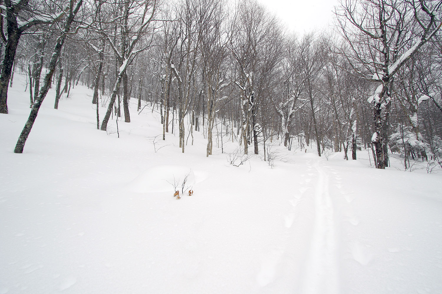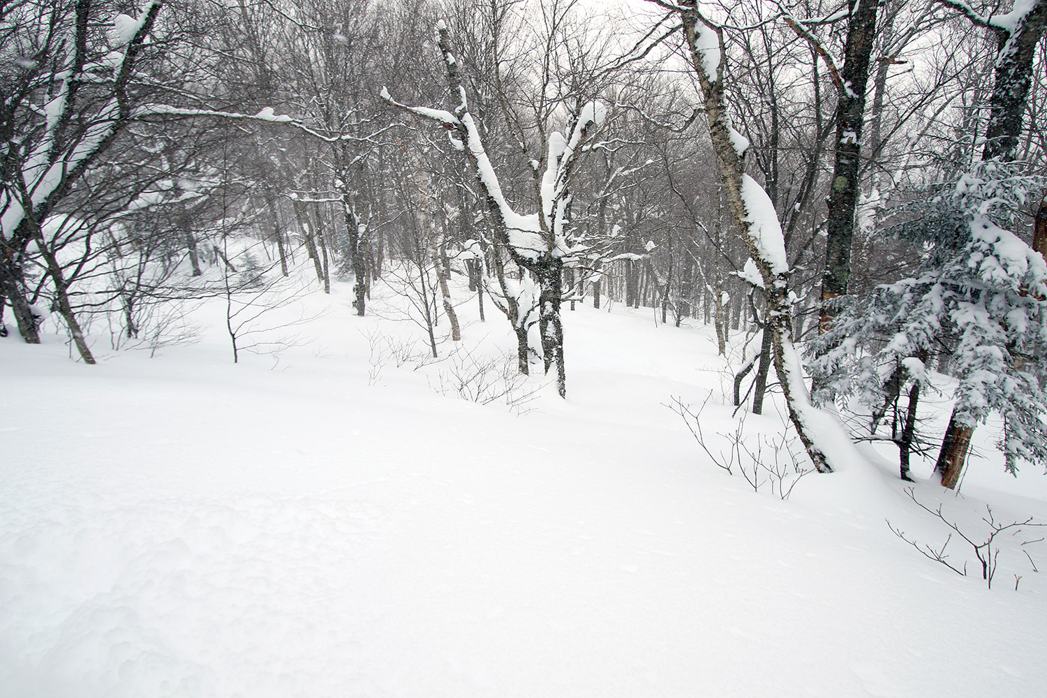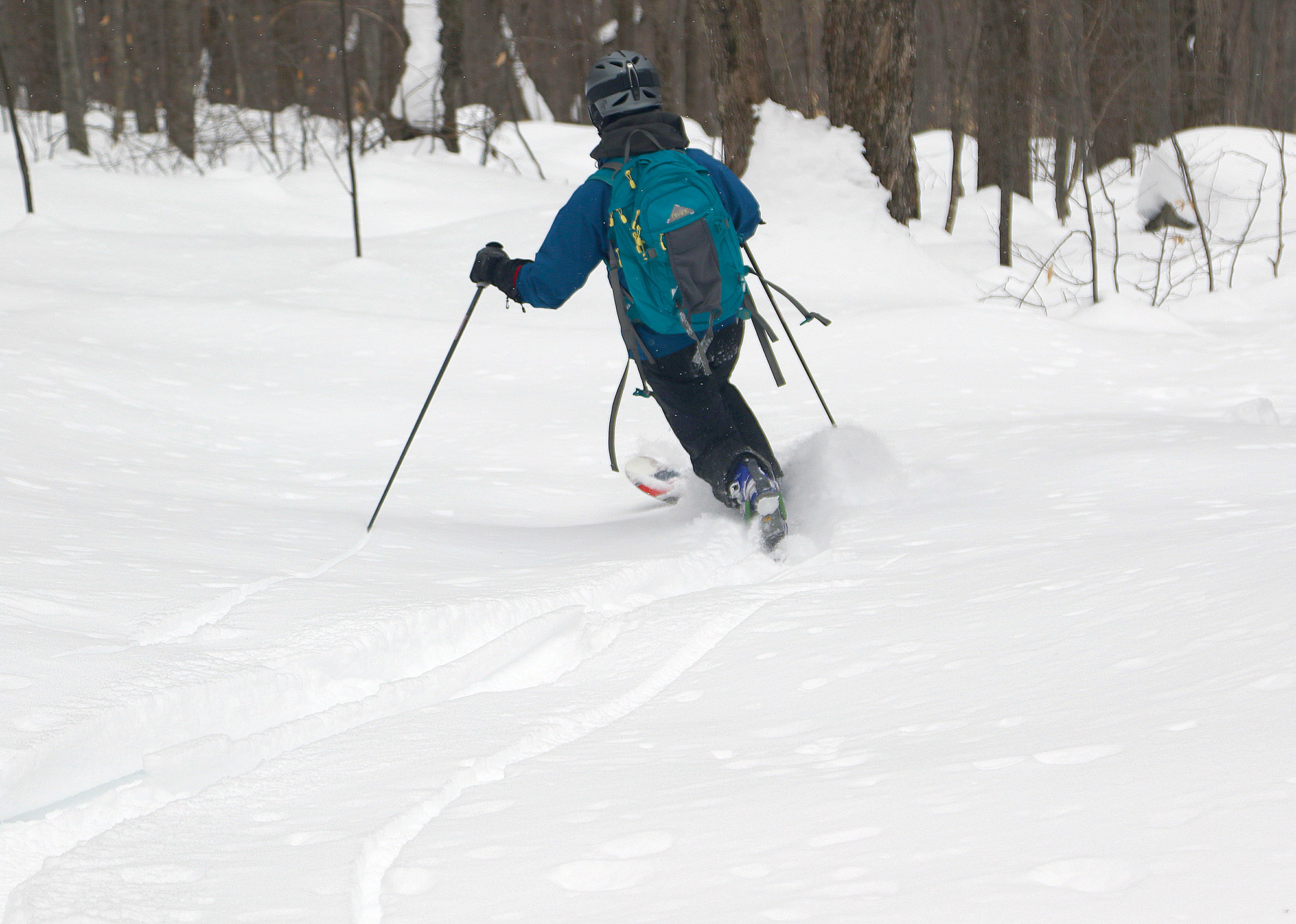 During yesterday’s tour, I was pressed for time, so on my descent from the Buchanan Shelter, I had to stick near Upper Beaver Pond. Today we had plenty of time, so we were able to explore more to the east to find the best lines. There’s plenty of open forest for turns, and we were able to pick some fantastic lines that brought us right back down on Deer Run near the junction with Beaver Pond. We also had plenty of time to enjoy additional turns in some of the low-angle powder on the return to the car.