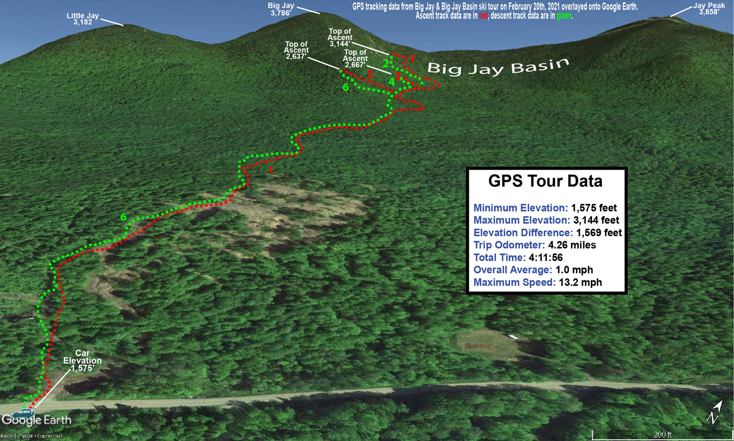 A Google Earth map with GPS tracking data for today’s tour in the Jay Peak Backcountry