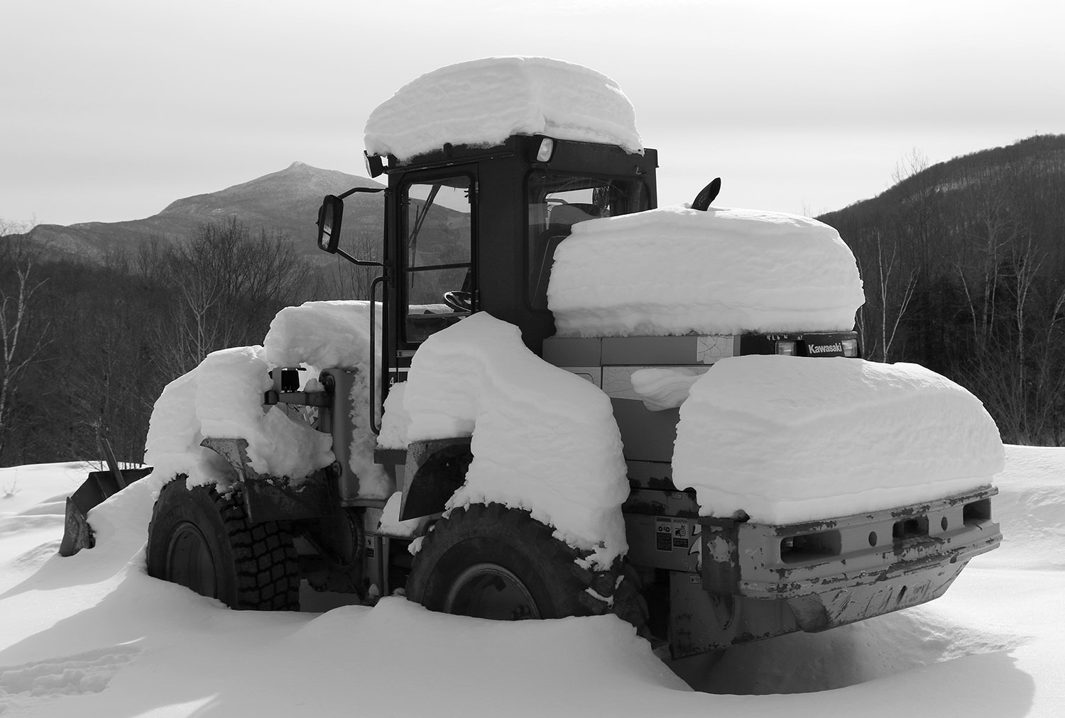 Views along today’s ski tour – a bucket loader covered with snow shows the various layers in the snowpack that have accumulated from recent storms.