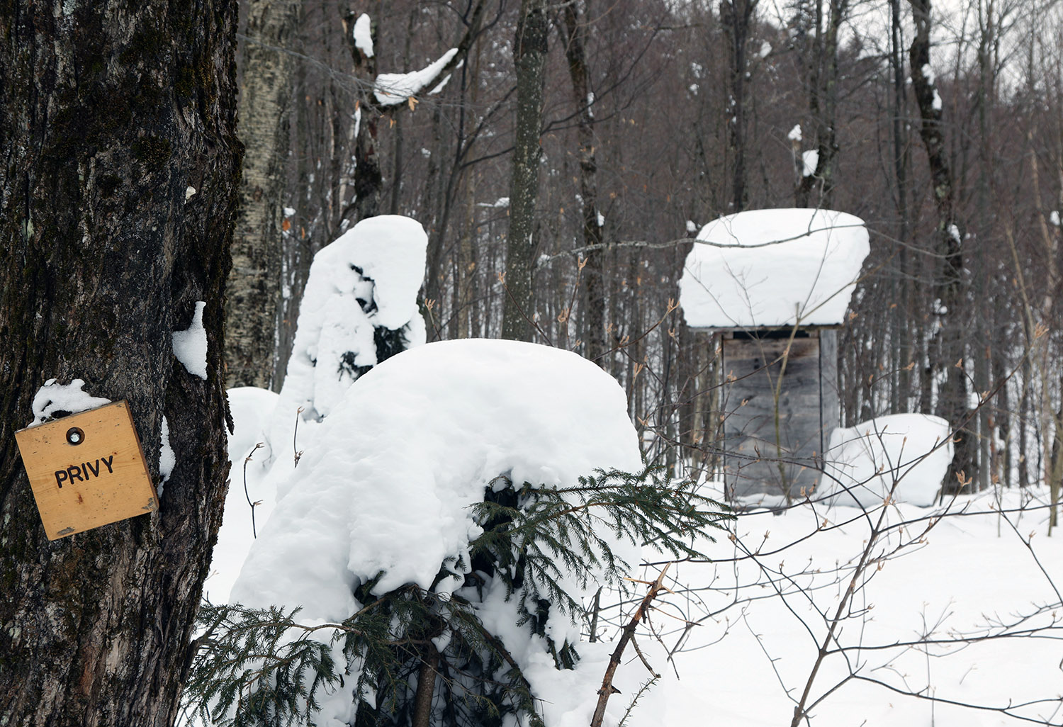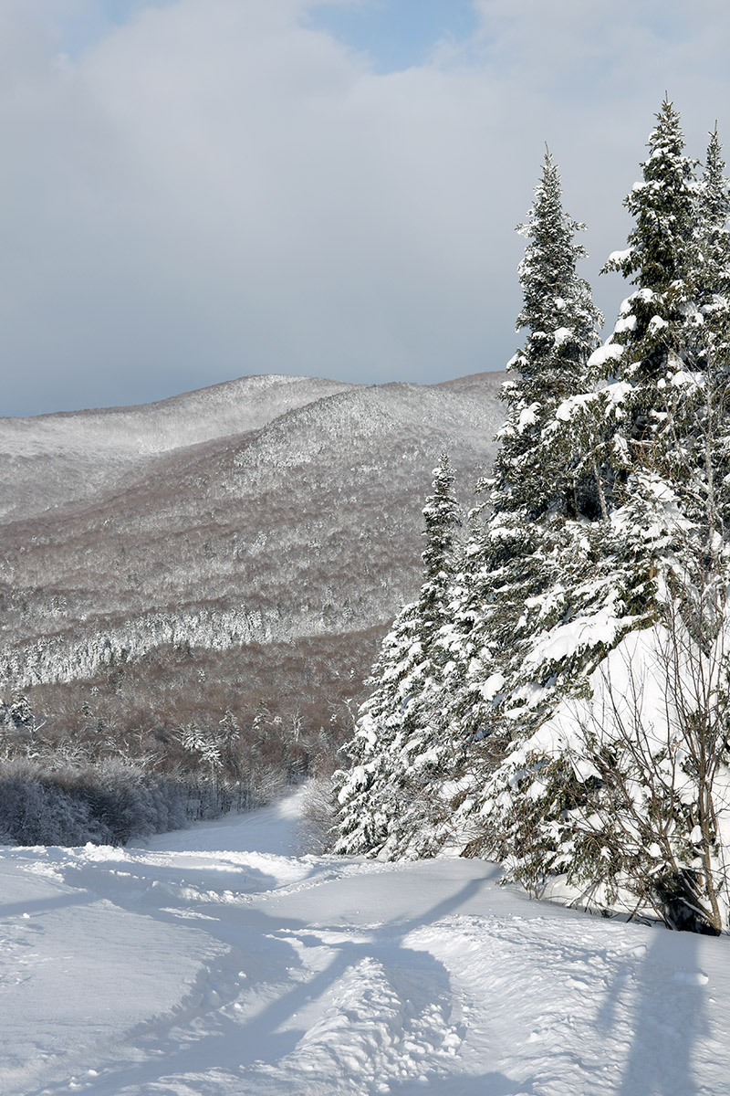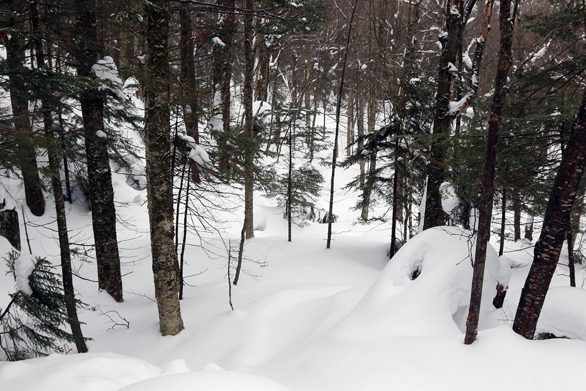The best powder skiing terrain on the tour was definitely on the slopes below the Buchanan Shelter, with some nice areas of open forest. The only sign of skiing in that area was an old ski track from someone that must have been there at least a couple of storms ago. I suspect traffic is generally light in this area because it requires an approach that’s close to two miles, vs. much quicker access in many other spots on the network. There’s a vast area of terrain for good descents off the ridge where Buchanan Shelter is located, enclosed by the Long Trail, Goat Path, Lower Maple Loop, Deer Run, and Beaver Pond.