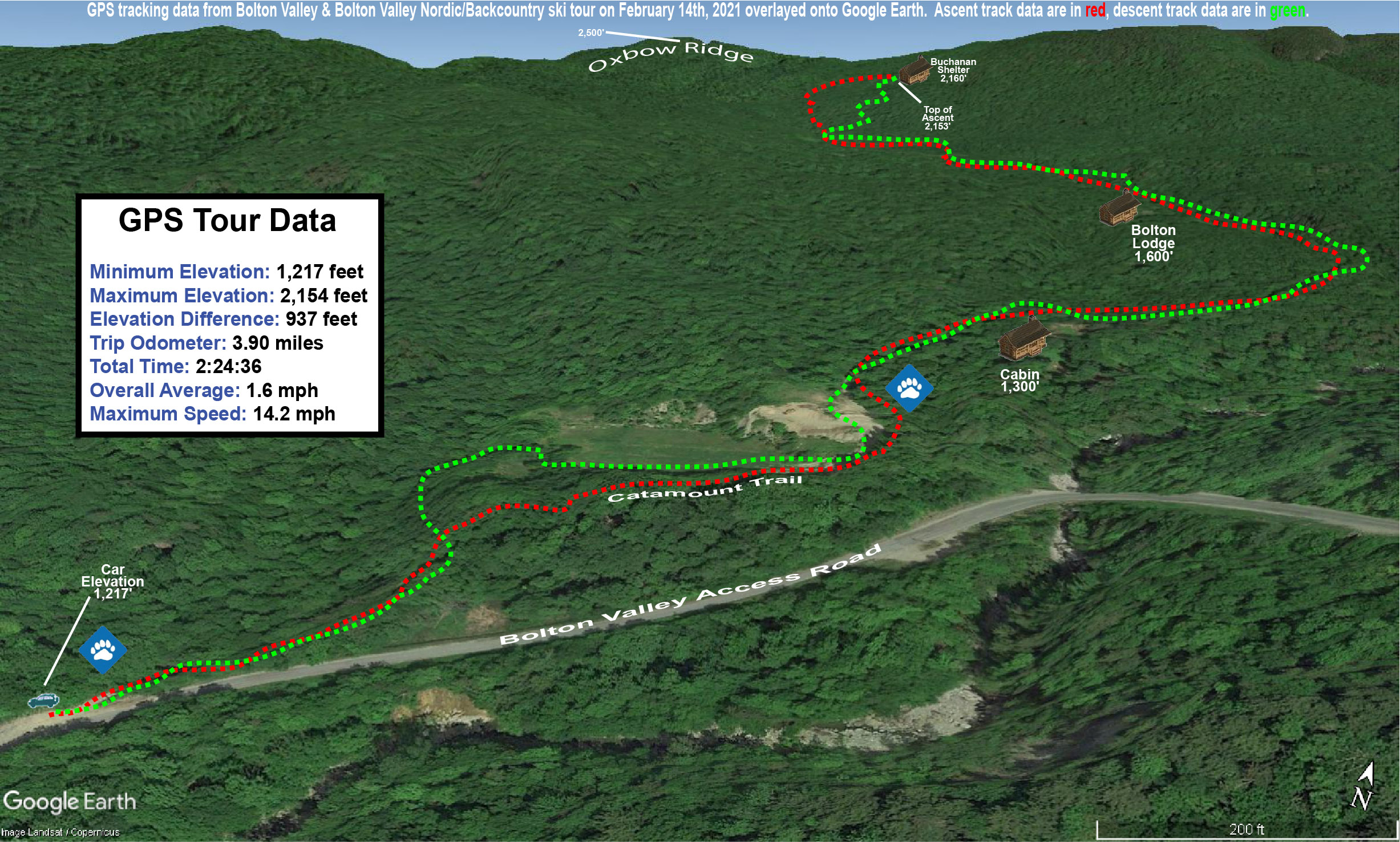 GPS Tracking for today’s tour on the Bolton Valley Nordic & Backcountry Network overlaid onto Google Earth