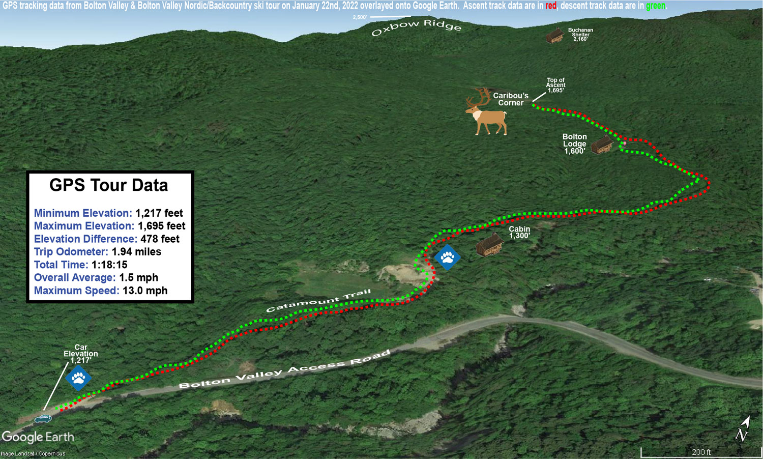 A Google Earth map with GPS tracking data for today’s tour on the Bolton Valley Nordic & Backcountry Network