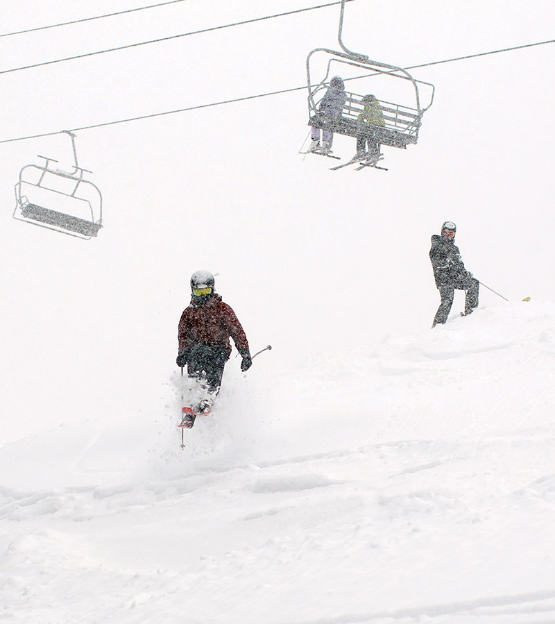The heavy snowfall rates were certainly one of the most impressive parts of today’s outing. The pace of accumulations was very evident while riding the lifts because of how fast you would get coated with snow. On one of our rides on the Vista Quad, Colin stayed still to catch the accumulation, so that was a lot of fun to see, and of course we had to get a picture. By the time we left around mid-afternoon, the resort must have picked up in the range of a foot of fresh snow, so the skiing just kept getting better. This is our first big, synoptic winter storm in a while, and it was just what the local resorts needed to really get the base depths up to snuff, and they should now be able to open up most of their terrain.