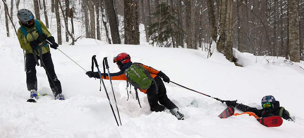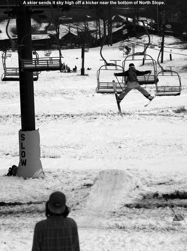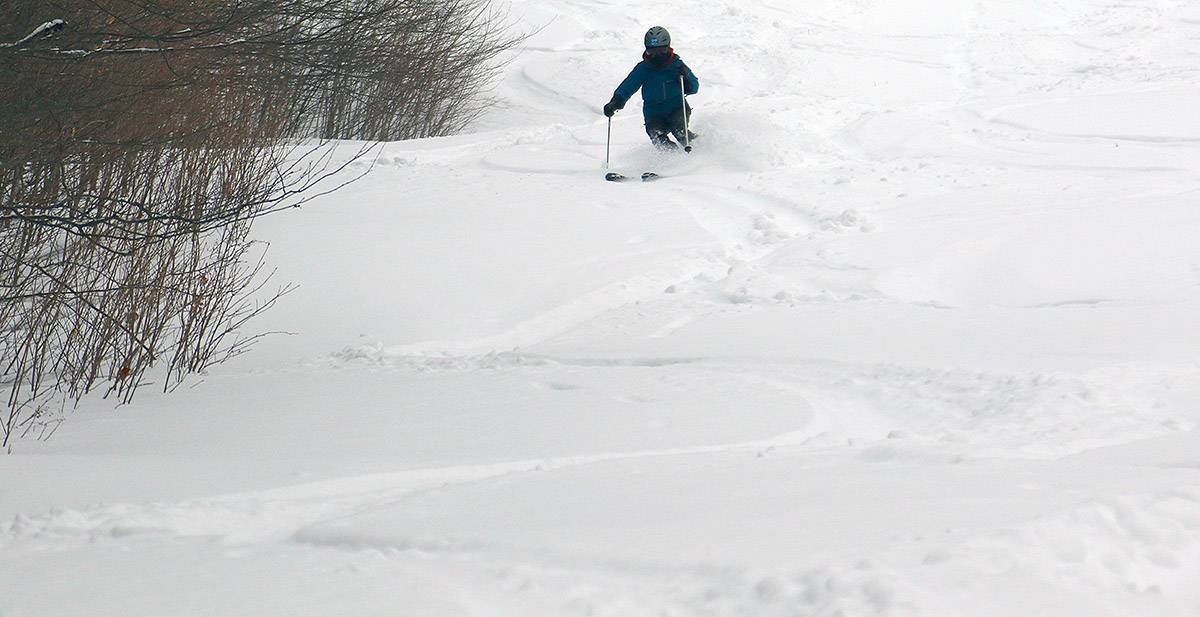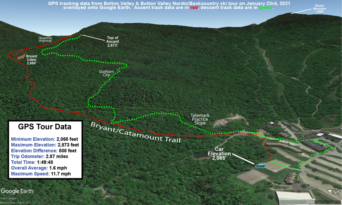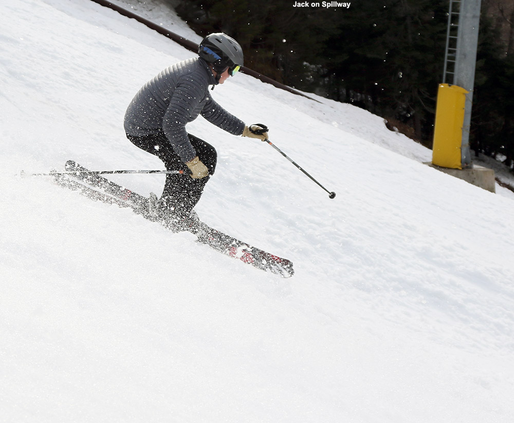 Today I headed to Bolton for turns, since it might be the last weekend for practical/productive touring there. Based on what I saw on my last Bolton outing a couple weeks ago, I figured the lower mountain would be discontinuous at this point, but the amount of snow on Spillway was obviously going to last a while. I decided to hike today vs. skinning, and I think that was the right call. The bottom half of the mountain has some decent areas of snow, but it’s discontinuous enough with plenty of dry ground for walking, such that hiking is the more practical option. Above Mid Mountain, one could skin up Spillway, but that’s really steep, and they’ve plowed Sherman’s Pass most of the way to the Vista Summit, so I used that for a lot of my ascent today.
